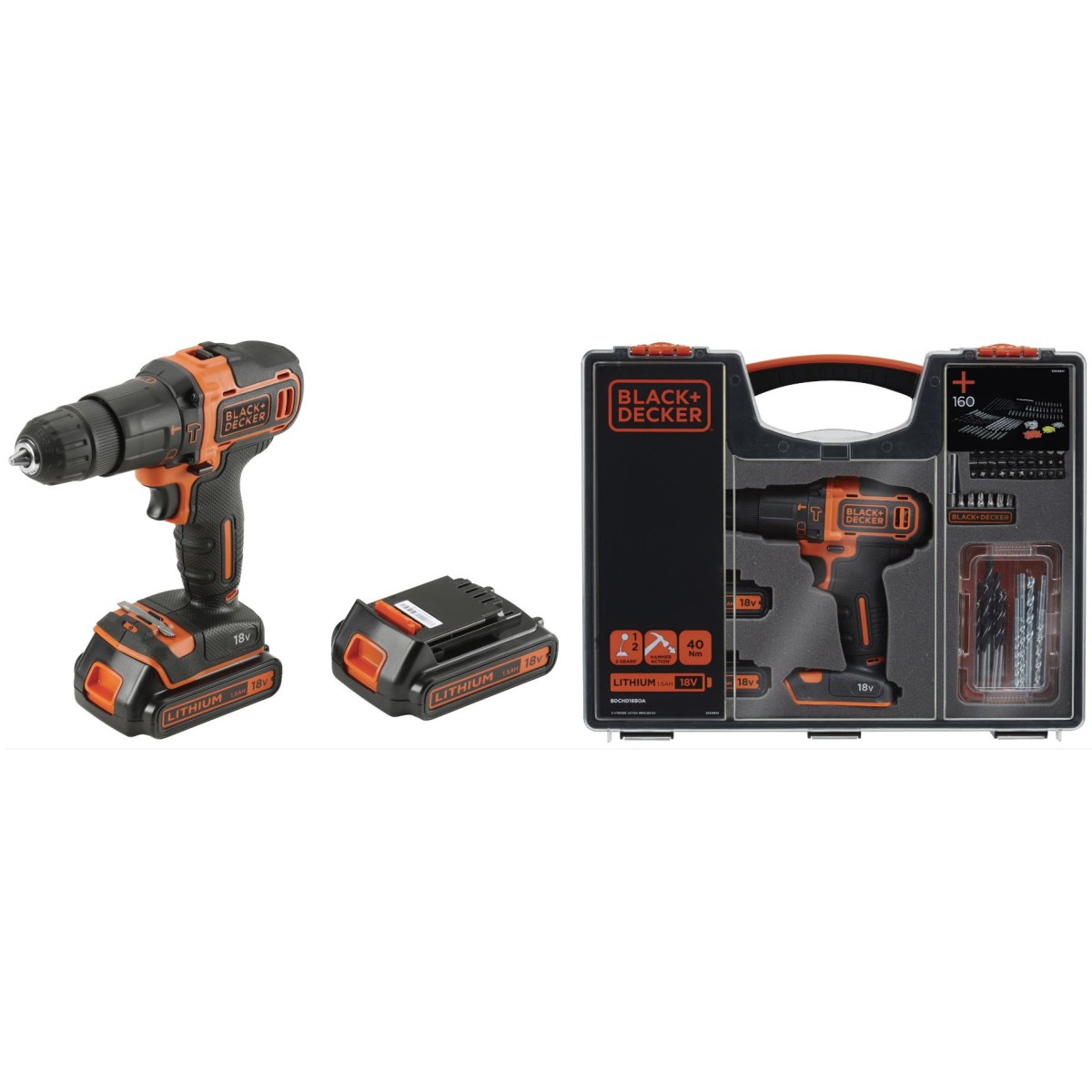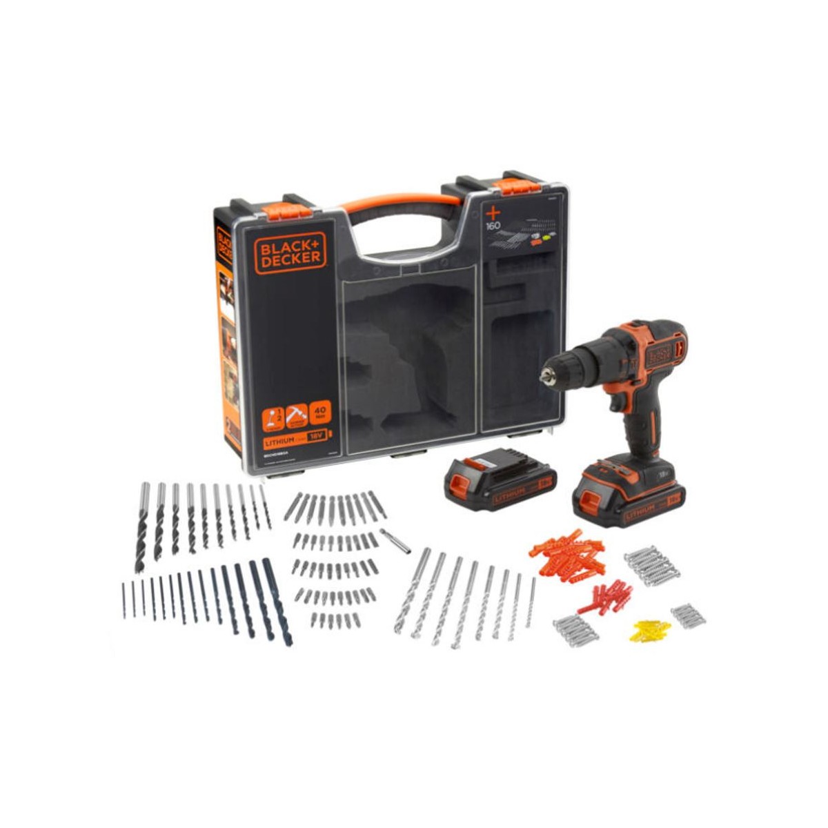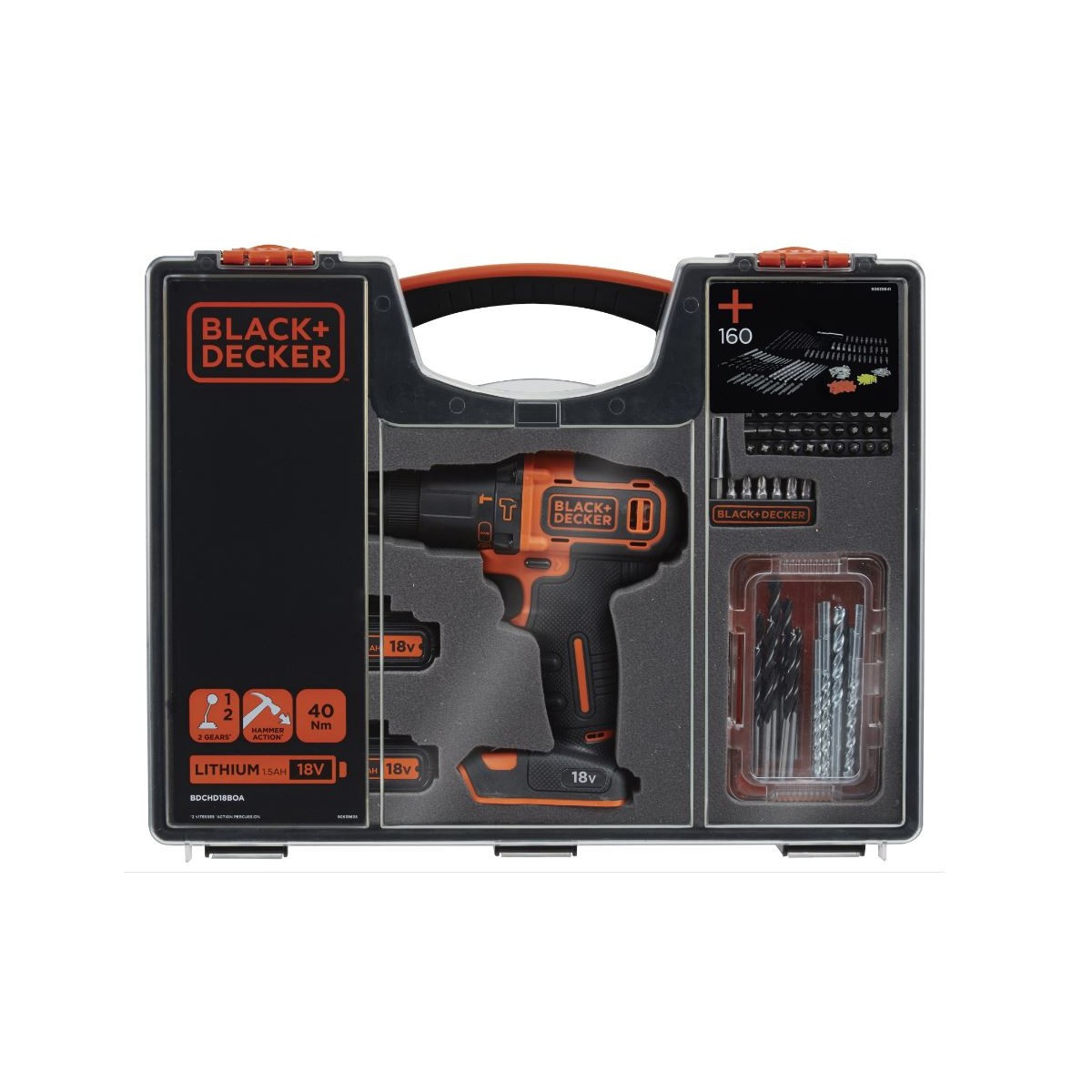 Perceuse à percussion sans fil 18V 2 batteries Lithium 1.5 Ah + 160 accessoires Black+Decker BDCHD18BOA