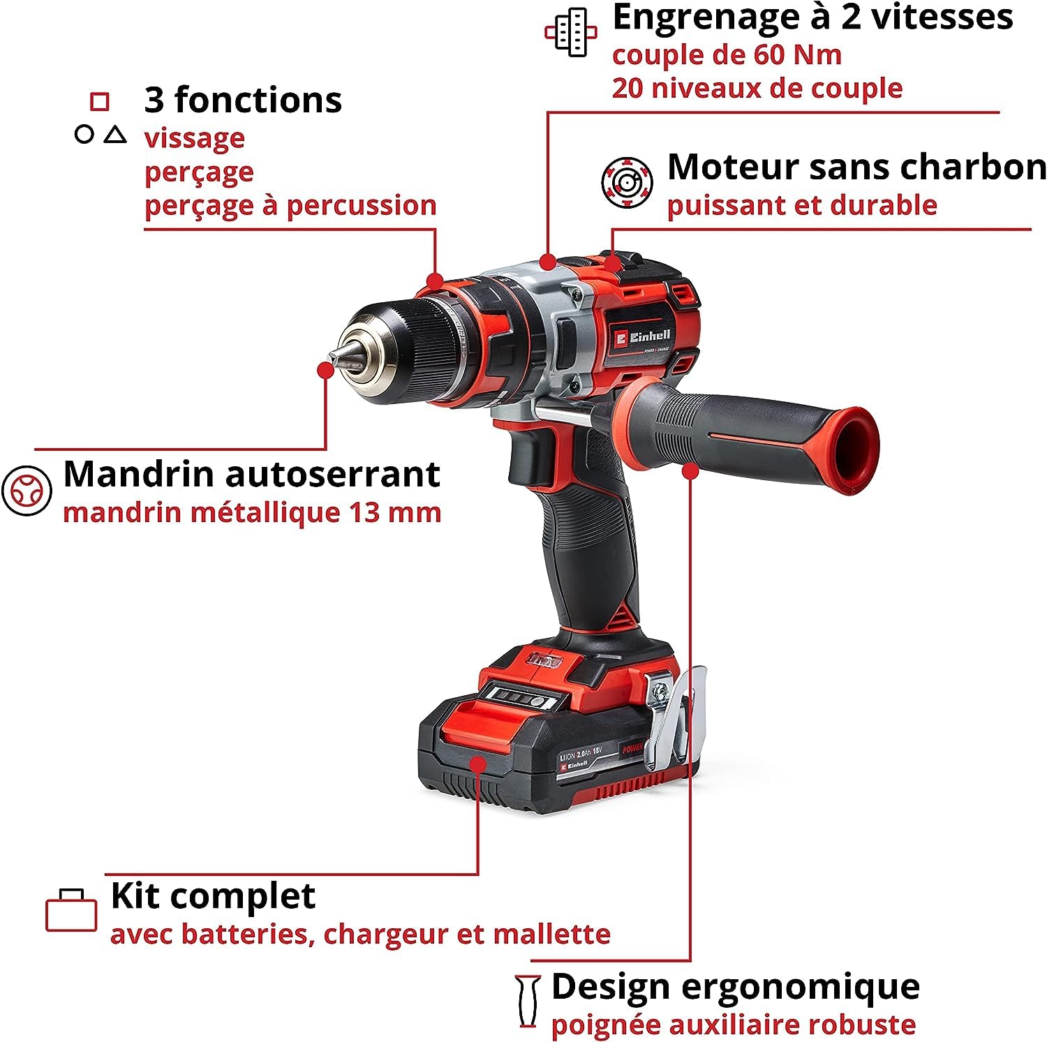 La visseuse-perceuse sans fil TE-CD 18 Li-i BL Einhell Brushless dispose d’un moteur dans charbon et vous fournit plus de puissance et fonctionne plus longtemps que les outils équipés de moteurs à charbon classique. La perceuse visseuse fait partie de la gamme Power X-Change. Les mêmes batteries et chargeurs lithium-ion rechargeables peuvent être utilisés pour tous les produits Power X-Change. La fonction marteau est d'une grande aide lorsque vous travaillez avec des matériaux durs. Le mécanisme de frappe fournit suffisamment de force pour percer la pierre et le béton. La perceuse a une transmission à 2 vitesses pour un outil puissant et un forage rapide. Vous pouvez changer rapidement les forêts à l'aide de la fonction d'arrêt rapide et du mandrin métallique de 13 millimètres. Le perçage à percussion demande beaucoup de force ainsi la poignée secondaire vous soulage du stress et réduit les vibrations. La conception ergonomique avec « Softgrip » vous donne un grand confort d’utilisation. La lumière LED vous éclaire dans les zones difficiles d’accès lors de vos travaux. Deux batteries lithium-ion PXC Power X-Change 2 Ah et un chargeur rapide sont inclus. La visseuse - perceuse est fourni dans une mallette de transport et de stockage pratique.