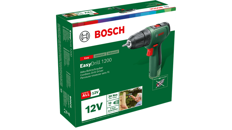 Bosch EasyDrill 1200. Conception du produit: Perceuse à poignée pistolet, Type de mandrin: Sans clé, Type de Moteur: Sans brosse. Capacité du mandrin (max): 1 cm, Vitesse de ralenti (max): 1500 tr/min, Diamètre de perçage dans le bois (max): 2 cm. Source d'alimentation: Batterie, Technologie batterie: Lithium-Ion (Li-Ion), Capacité de la batterie: 1,5 Ah. Poids: 940 g, Largeur: 209 mm, Profondeur: 232 mm