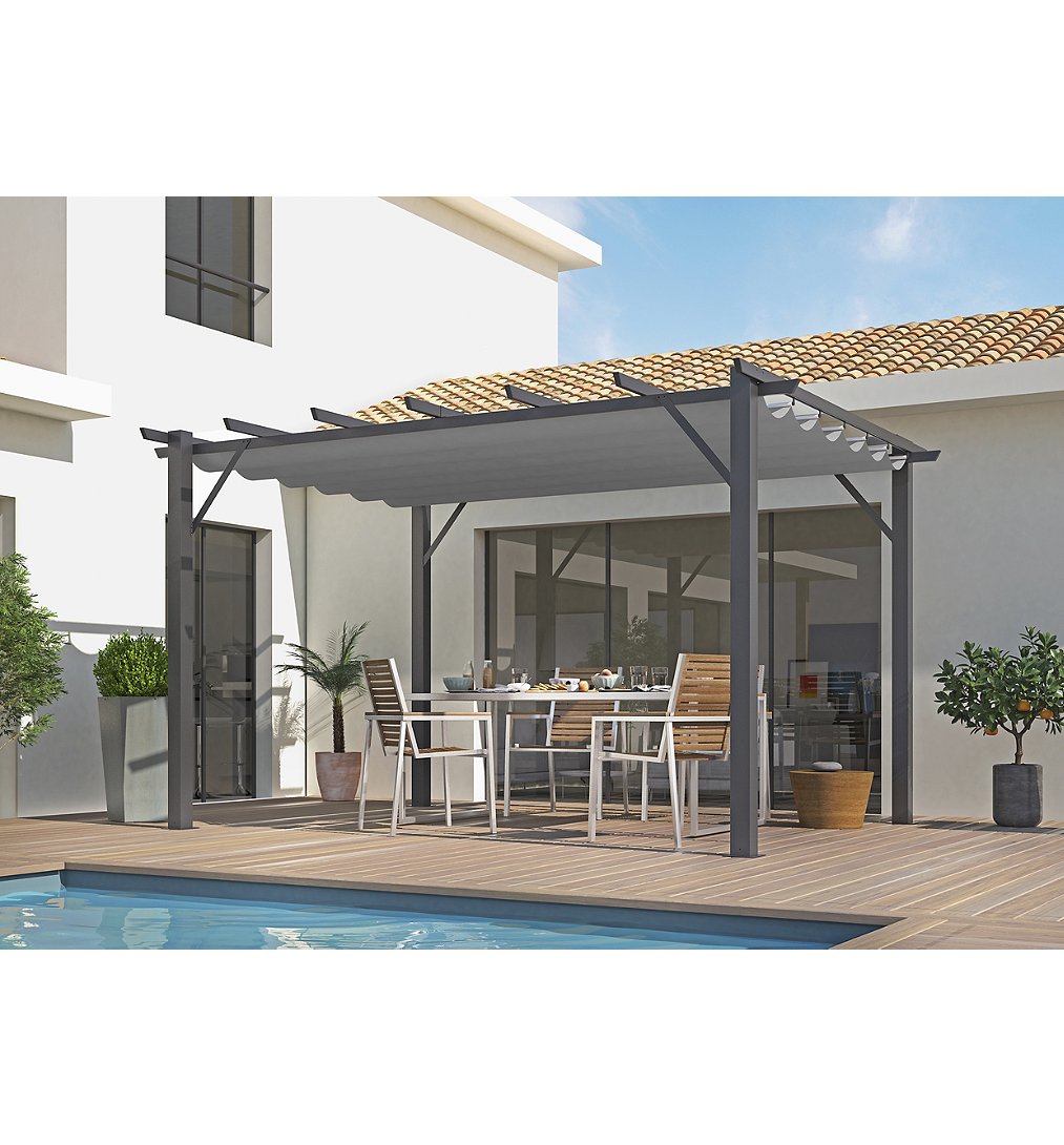 Pergola avec 7 lambourdes fabriquée en aluminium haute performance Dimensions l 400 x L 300 x H 230 cm Largeur entre poteaux (côté) : 241 cm Largeur entre poteaux (face) : 341 cm Hauteur de passage : 206 cm Coloris de la structure : gris anthracite Coloris de la toile de protection : gris Livré avec - 4 poteaux aluminium 100 x 100 mm épaisseur 1,2 mm avec platines de fixation - 7 lambourdes aluminium 30x60 mm épaisseur 1 mm - 1 toile de protection : densité 140 gr/m2 100 % polyester échangeable couleur gris - 2 poignées individuelles pour ouverture et fermeture de la toile - aimant pour blocage de la toile sur un des côtés - toile coulissante par système de tringle - bandeau avant et arrière pour protection de la toile en position pliée 140 gr/m2 100 % polyester * Garantie : 5 ans contre une déformation de la structure (et non sur la finition) 1 an sur la toile