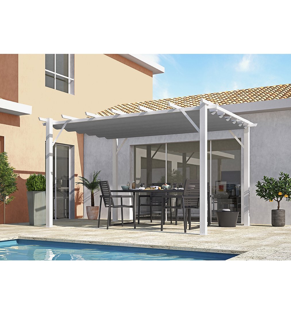 Pergola avec 7 lambourdes fabriquée en aluminium haute performance Dimensions l 400 x L 300 x H 230 cm Largeur entre poteaux (côté) : 241 cm Largeur entre poteaux (face) : 341 cm Hauteur de passage : 206 cm Coloris de la structure : blanc Coloris de la toile de protection : gris Livré avec - 4 poteaux aluminium 100 x 100 mm épaisseur 1,2 mm avec platines de fixation - 7 lambourdes aluminium 30x60 mm épaisseur 1 mm - 1 toile de protection : densité 140 gr/m2 100 % polyester échangeable couleur gris - 2 poignées individuelles pour ouverture et fermeture de la toile - aimant pour blocage de la toile sur un des côtés - toile coulissante par système de tringle - bandeau avant et arrière pour protection de la toile en position pliée 140 gr/m2 100 % polyester * Garantie : 5 ans contre une déformation de la structure (et non sur la finition) 1 an sur la toile