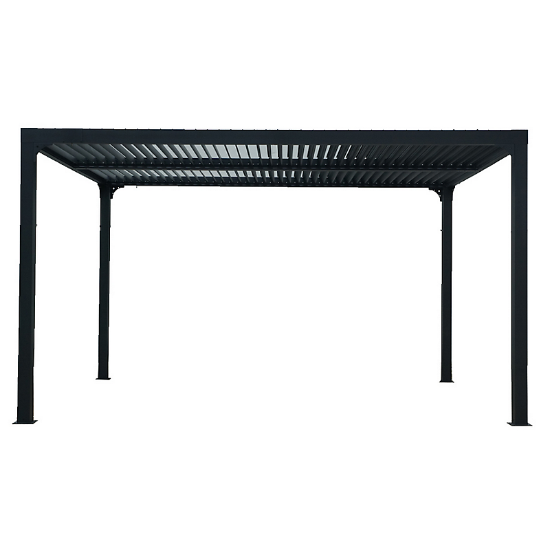 Pergola bioclimatique structure en aluminium protégée par un revêtement époxy, avec 78 lames à ouverture avec une manivelle Dimensions hors tout l 360 x L 300 cm Largeur entre poteaux (côté) : 274 cm ; Largeur entre poteaux (face) : 334 cm Hauteur totale : 231 cm Hauteur de passage : 219 cm Surface de protection : 10,80 m² Toit de lames ovales 90 mm épaisseur 1 mm en aluminium ouverture manuelle avec une manivelle Coloris de la structure : gris anthracite Structure, lambourdes et pièces de raccordement en aluminium Quincaillerie inox pour la pergola Livré avec : - 4 poteaux aluminium 100 x 100 mm épaisseur 1,2 mm avec platines de fixation 16 x 16 cm épaisseur 3 mm - 4 lambourdes latérales de 58 cm x 58 mm épaisseur 1,2 mm - 1 lambourde centrale de 101 x 101 mm épaisseur 1,2 mm * Garantie : 5 ans contre une déformation de la structure (et non sur la finition)