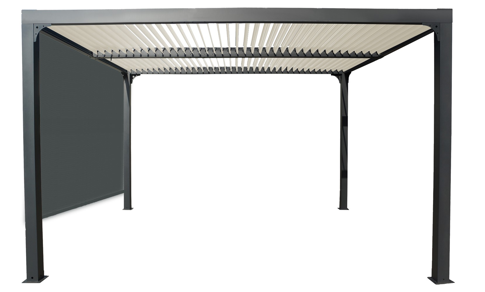 Pergola bioclimatique structure en aluminium protégée par un revêtement époxy, avec 78 lames à ouverture avec une manivelle couleur écru avec rideau pour côté 3 m Dimensions hors tout l 360 x L 300 cm Largeur entre poteaux (côté) : 274 cm ; Largeur entre poteaux (face) : 334 cm Hauteur totale : 231 cm Hauteur de passage : 219 cm Surface de protection : 10,80 m² Rideau en PVC tissé dimensions 2,80 x H 2,20 m avec rail pour côté 3 m couleur gris clair réglable manuellement en hauteur Toit de lames ovales 90 mm épaisseur 1 mm en aluminium ouverture manuelle avec une manivelle Coloris de la structure : gris anthracite Coloris des ventelles : écru Coloris du rideau latéral : gris Structure, lambourdes et pièces de raccordement en aluminium Quincaillerie inox pour la pergola Livré avec : - 4 poteaux aluminium 100 x 100 mm épaisseur 1,2 mm avec platines de fixation 16 x 16 cm épaisseur 3 mm - 4 lambourdes latérales de 58 cm x 58 mm épaisseur 1,2 mm - 1 lambourde centrale de 101 x 101 mm épaisseur 1,2 mm * Garantie : 5 ans contre une déformation de la structure (et non sur la finition) ventelles 2 ans rideau 1 an