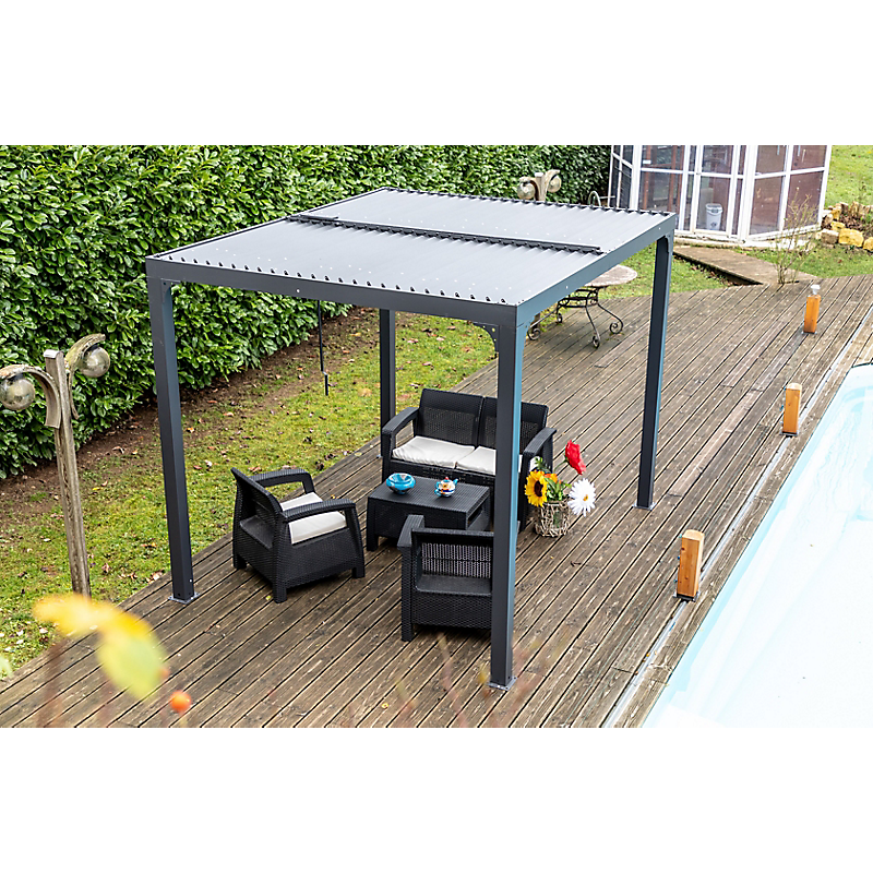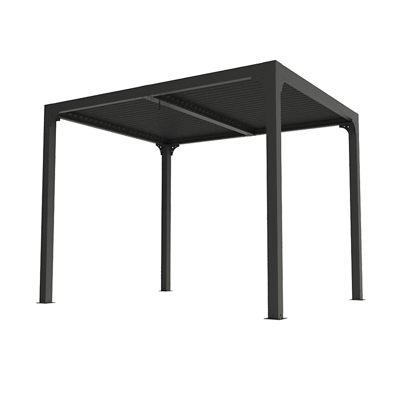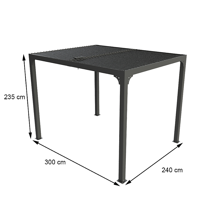 Pergola bioclimatique structure en aluminium protégée par un revêtement époxy, avec 52 lames à ouverture avec une manivelle Dimensions hors tout l 240 x L 300 cm Largeur entre poteaux (côté) : 222,3 cm ; Largeur entre poteaux (face) : 280 cm Hauteur totale : 235 cm Hauteur de passage : 219 cm Surface de protection : 7,20 m² Toit de lames ovales 90 mm épaisseur 1 mm en aluminium ouverture manuelle avec une manivelle Coloris de la structure : gris anthracite Structure, lambourdes et pièces de raccordement en aluminium Quincaillerie inox pour la pergola Livré avec : - 4 poteaux aluminium 100 x 100 mm épaisseur 1,2 mm avec platines de fixation 16 x 16 cm épaisseur 3 mm - 4 lambourdes latérales - 1 lambourde centrale *Garantie : 5 ans contre une déformation de la structure (et non sur la finition)