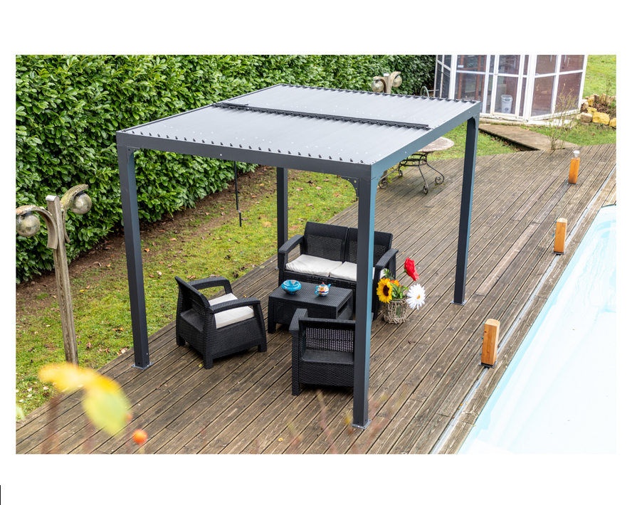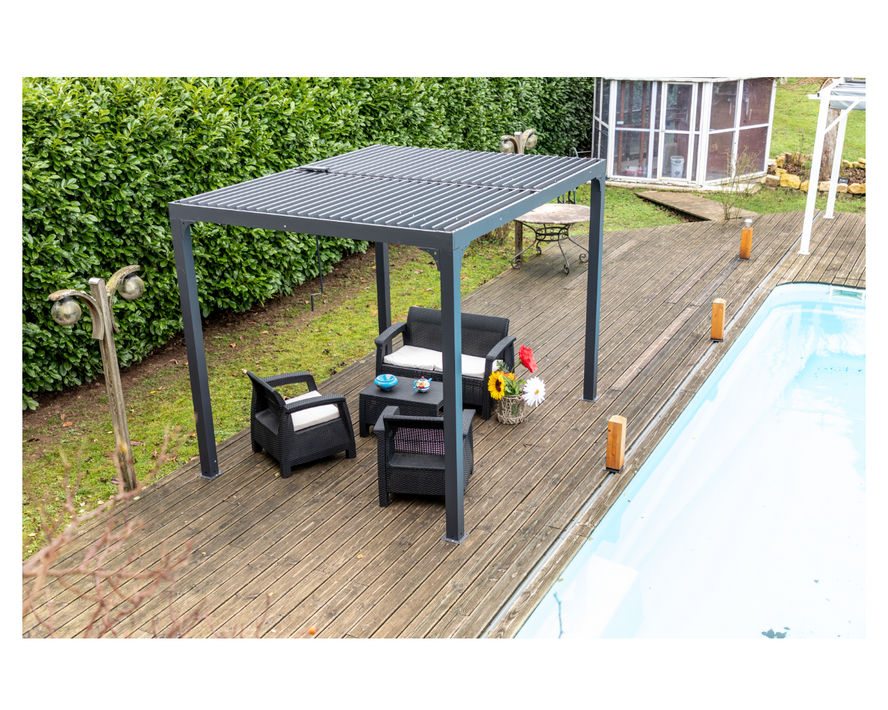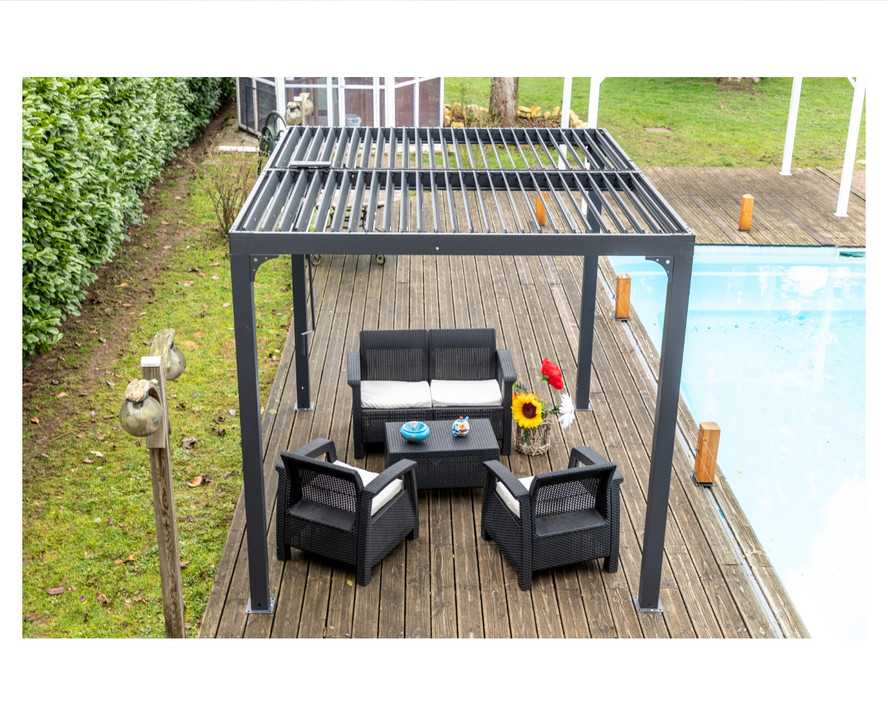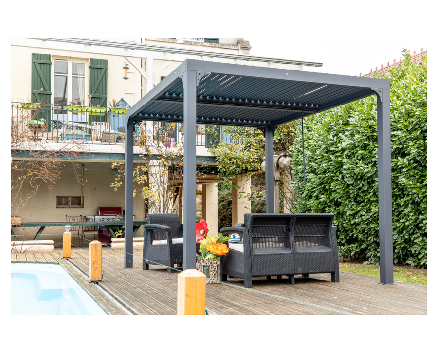 Pergola bioclimatique ALUMINIUM balcon et terrasse coloris gris anthracite / Surface de protection : 7,20