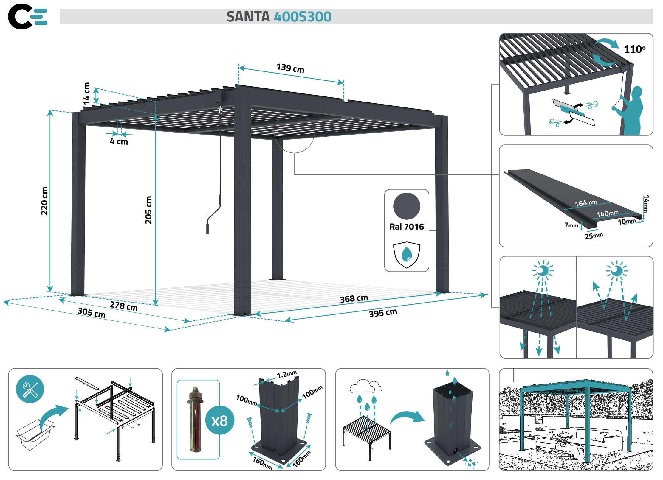 | Libellé | Pergola Bioclimatique autoportée SANTA 400S300 - Aluminium - Gris anthracite - Lames orientables acier |