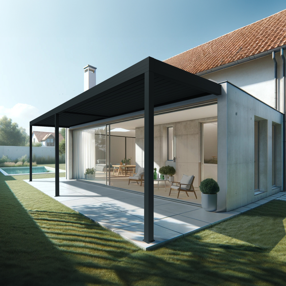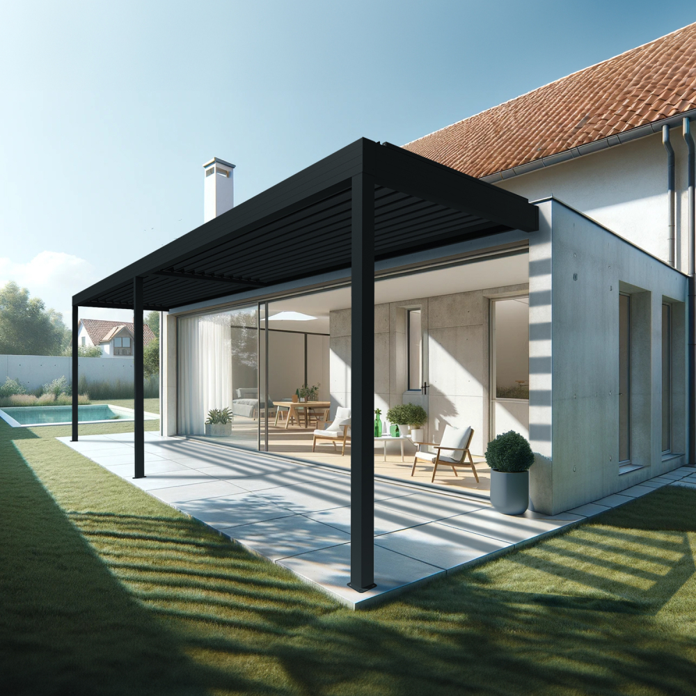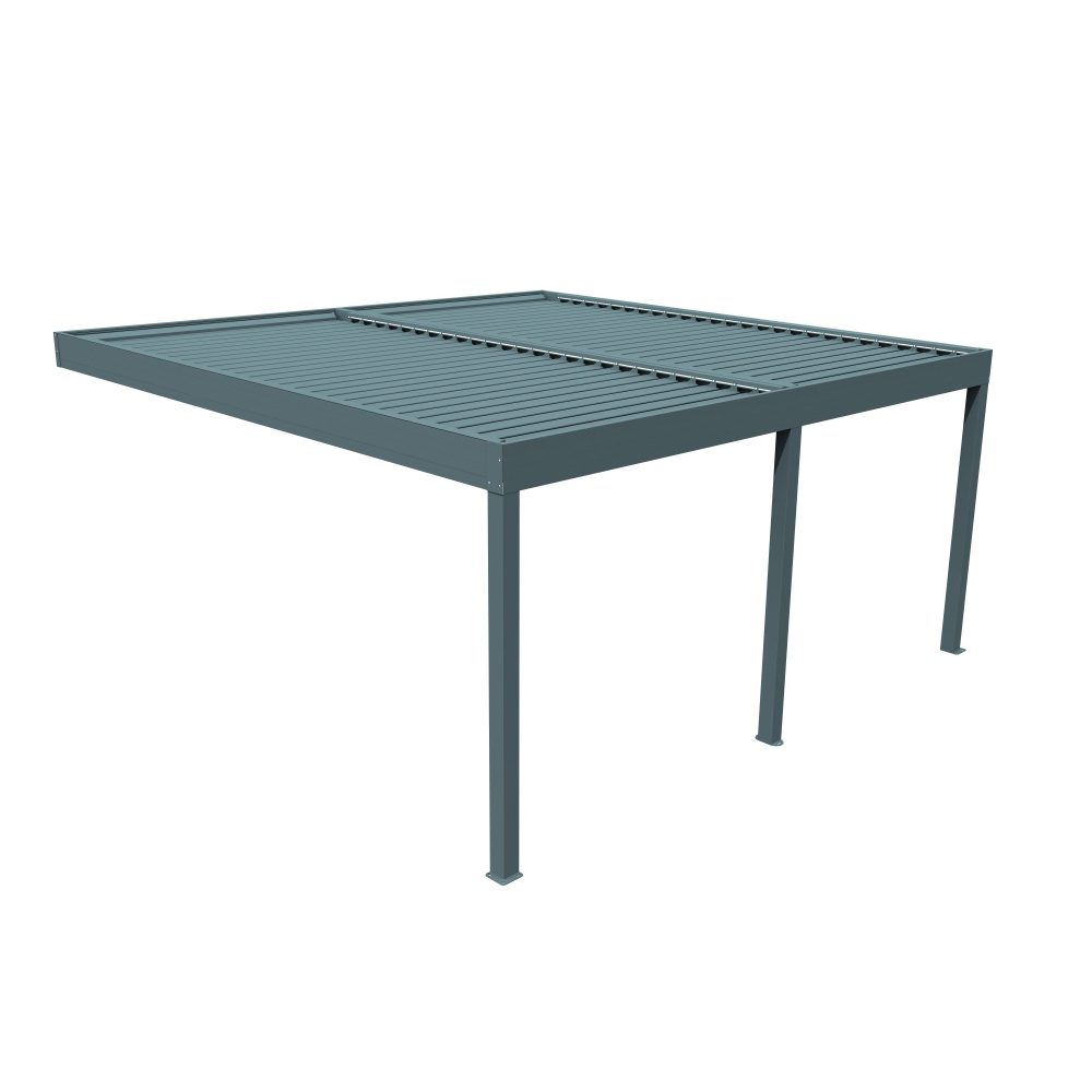 C'est la pergola bioclimatique modulable de grande dimension avec lames à double paroi et une manœuvre 2 vérins/module.