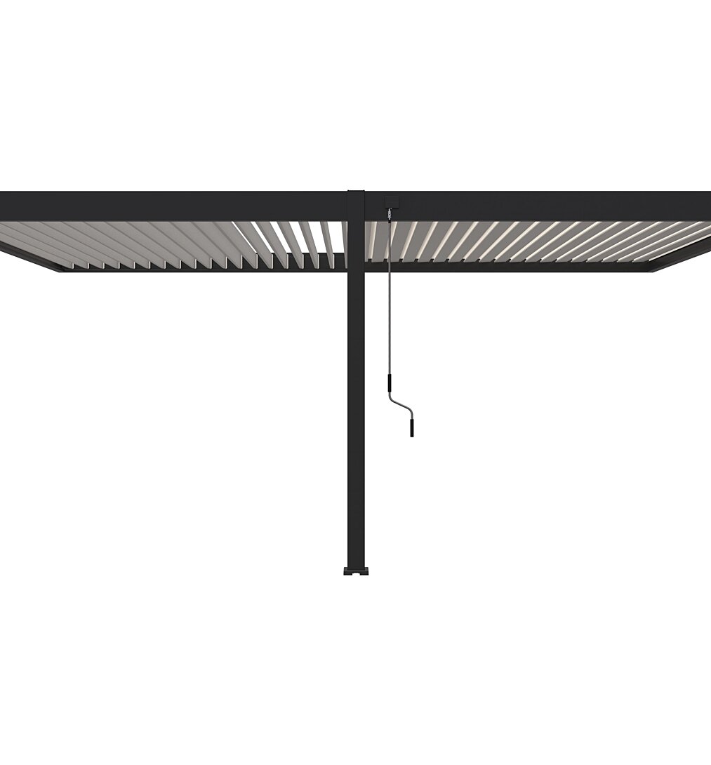 La pergola bioclimatique Ombréa de la gamme V2 4x6 adossée, offre la plus grande ampleur de la collection. Fixée à votre résidence, restaurant ou hôtel elle vous proposera une solution d’ombrage élégante. Sa dimension spacieuse vous permettra de ne pas être gêné par les caprices de la météo. Ses 38 lames doubles orientables jusqu’à 135° offrent de nombreuses possibilités d’ajustement de la lumière, de l’ombre et de la ventilation par le biais de 2 manivelles contrôlées manuellement. Une fois le toit entièrement fermé, elle est étanche permettant de rester au sec par temps de pluie sous la pergola. L’eau sera évacuée à travers les gouttières situées au niveau des poutres puis redirigées par les poteaux. Conçue en aluminium et résistante à des vents jusqu’à 100km/h c’est une pergola d’une grande qualité. La pergola Ombréa® est à monter soi-même, le montage se déroulera simplement, à 2 ou 3 personnes en un temps moyen d’une journée. La pergola est à monter sur une base solide en béton. La quincaillerie prévue dans le colis pour fixer la pergola est destinée aux murs pleins. Pour l’installer dans un parpaing creux il faudra utiliser des chevilles Molly, des chevilles à clouer ou des chevilles auto-foreuses. En cas de chute de neige, nous recommandons de laisser les lames ouvertes pour éviter tout dommage.