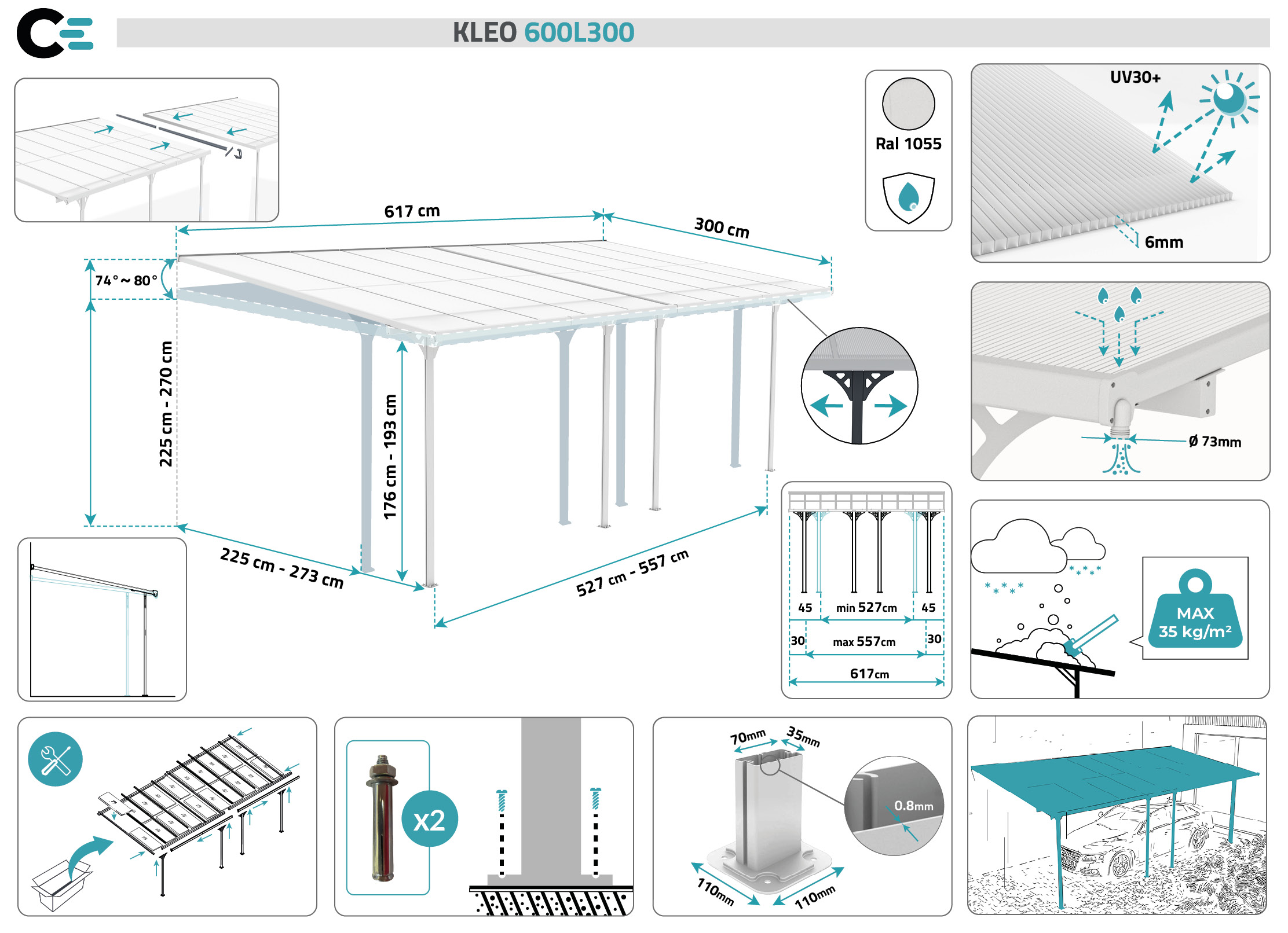 Couvrant une surface de près de 18 m² le modèle KLEO, installé en tant que carport, vous permettra de garer confortablement votre ou vos véhicule(s) à l’abri des intempéries et de la chaleur.
