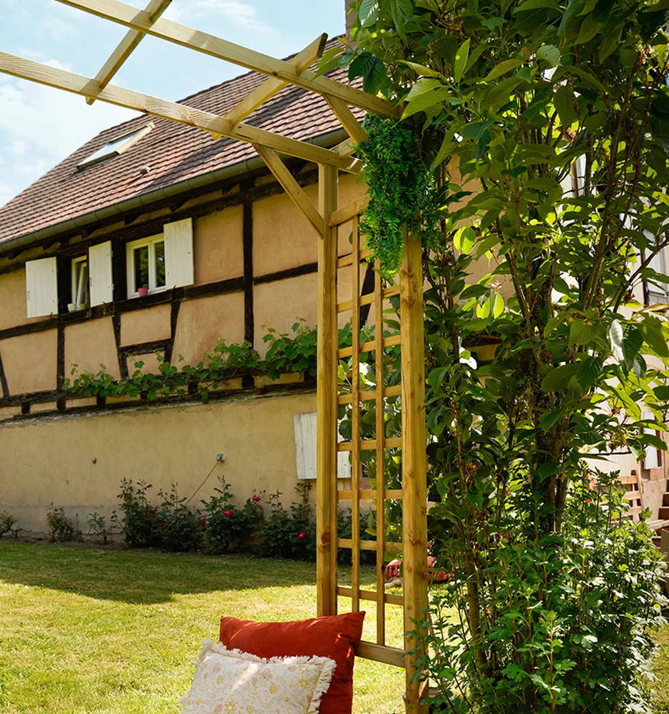 La pergola VALERIANE, en un clin d’œil, devient un élément décoratif où s’épanouiront les plantes grimpantes.