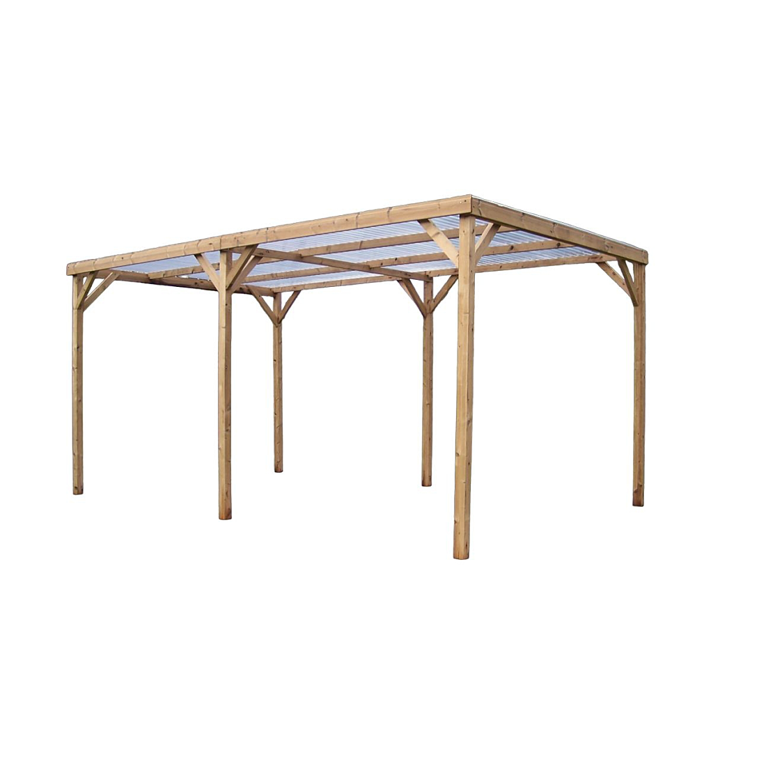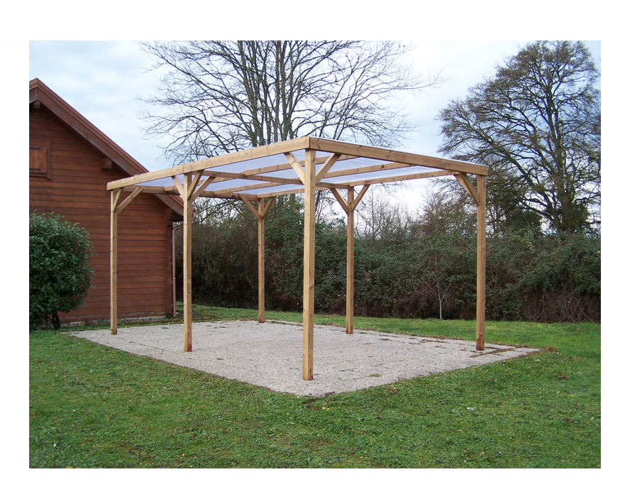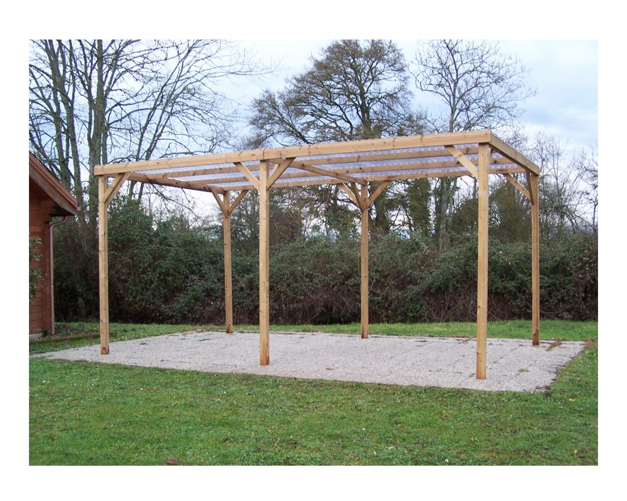 Pergola fabriquée en sapin traité très haute température à 215°C sans aucun ajout de produit de synthèse Dimensions 302x500 cm Hauteur de passage : 224 cm / hauteur totale : 241 cm Largeur de passage : 280 cm / 235 cm Surface utile 15,10 m2 Livré avec 6 poteaux 7x8 cm Couverture plaques ondulées PVC transparentes Fabriqué en France Garantie : 2 ans Produit PEFC A monter soi-même
