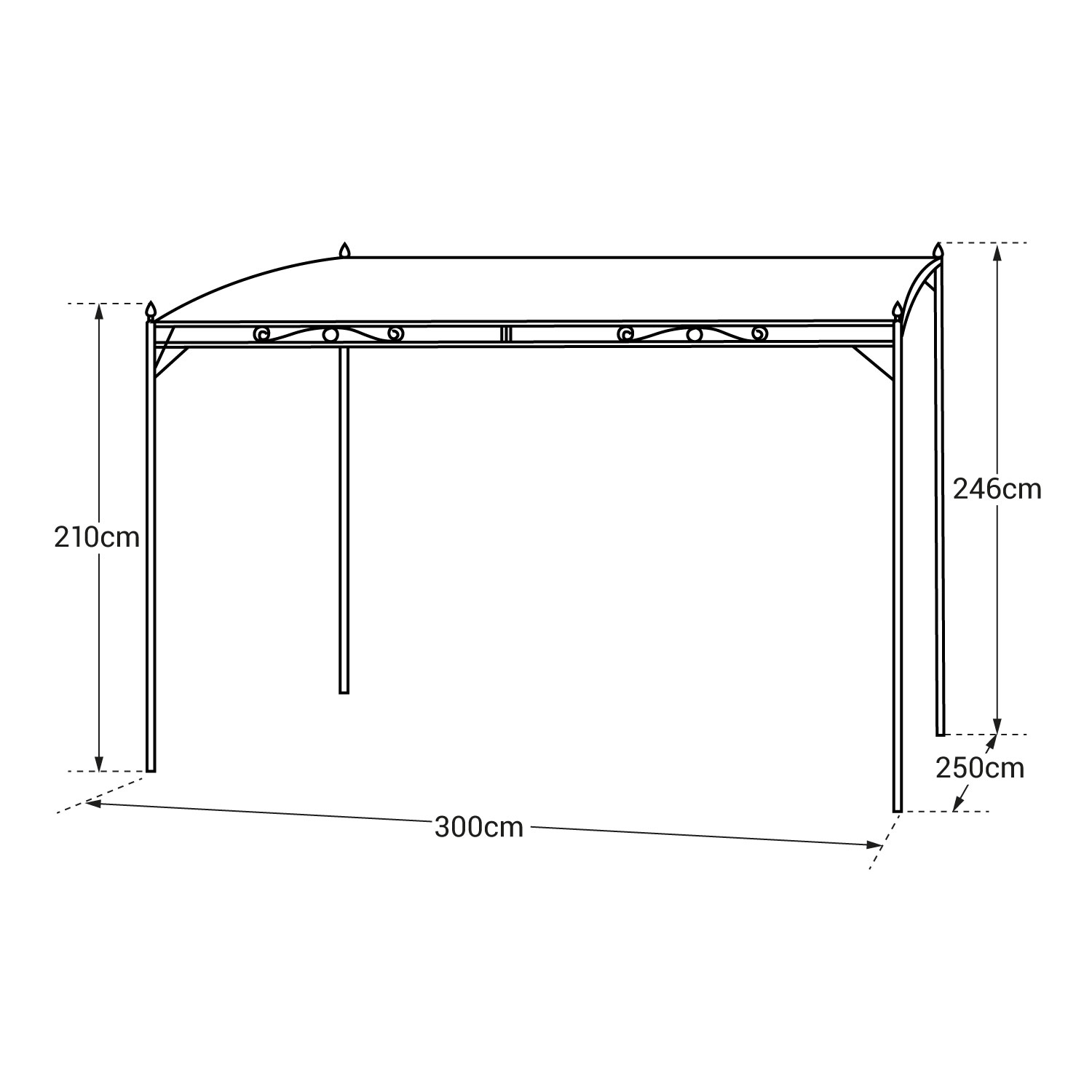 - Pergola : L 300 × l 250 × H latérale max 246cm / min 210cm