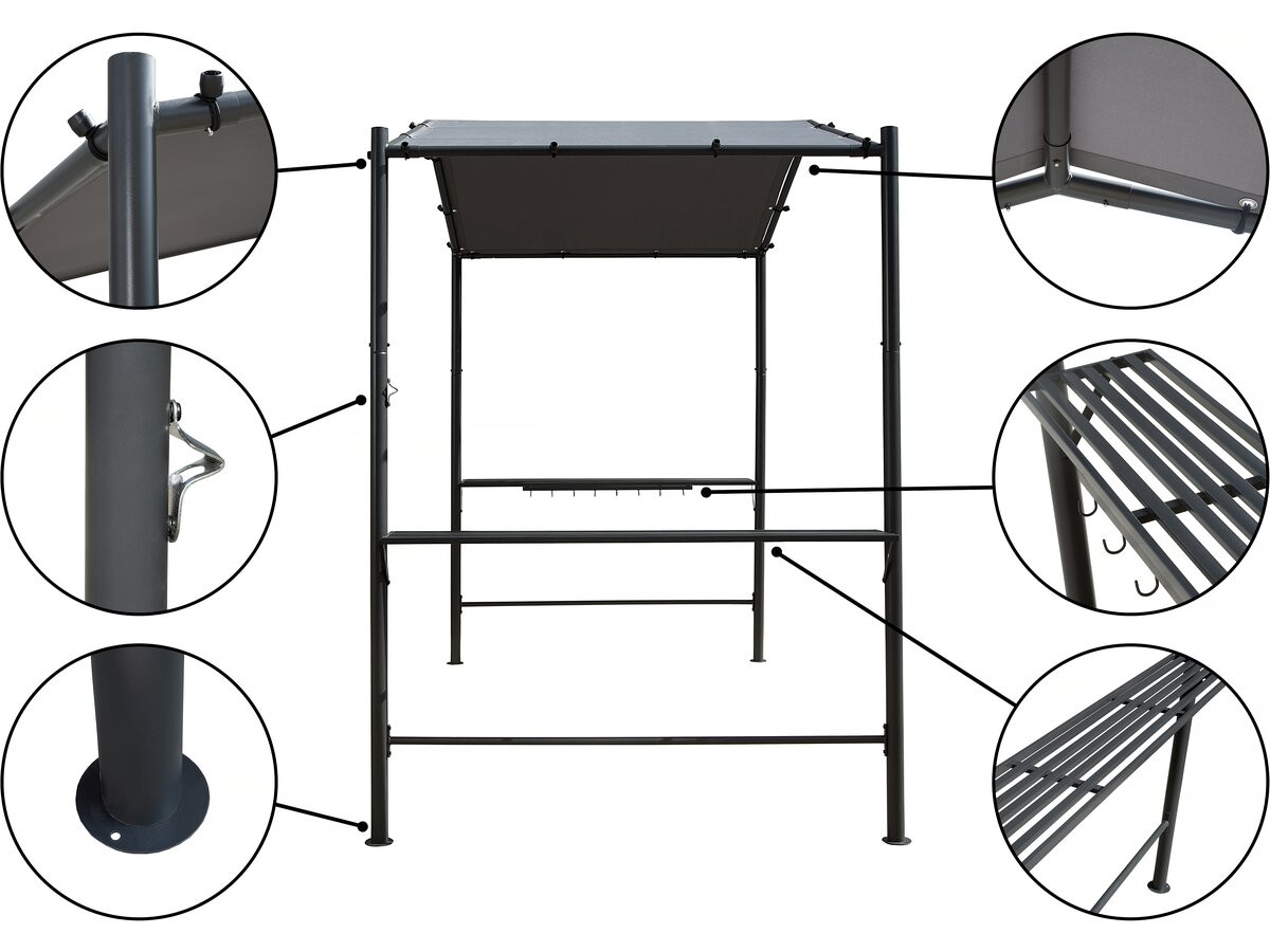 Pergola pour barbecue - 277 x 149 x 232 cmCette pergola est conçu pour protéger votre barbecue des intempéries tout en offrant un espace pratique et esthétique pour cuisiner en extérieur. Avec ses dimensions généreuses, 2.77 x 1.49 x 2.32 m, elle offre ainsi suffisamment d'espace pour installer votre barbecue en toute sécurité.Fabriqué en métal, cette pergola est traité contre les UV et la rouille, ce qui lui permet de résister aux conditions climatiques extérieures, même après une exposition prolongée au soleil ou à la pluie. Sa structure est également résistante à l'eau, garantissant une protection efficace contre l'humidité.Dotée d'un coloris anthracite moderne et élégant, elle s'intègre parfaitement dans tout type d'environnement extérieur, que ce soit dans un jardin, sur une terrasse ou un balcon. Vous pourrez ainsi profiter de vos moments de barbecue en toute tranquillité !Abri pour barbecue avec tablettes latérales - Dimensions : 277 x 149 x 232 cm - Métal - Traitement anti-uv et antirouille - Résistant à l'eau - Anthracite .Descriptif: Abri pour barbecue - Dimension : 2.77 x 1.49 x 2 m - Métal - Traitement anti-uv et antirouille - Résistant à l'eau - Anthracite