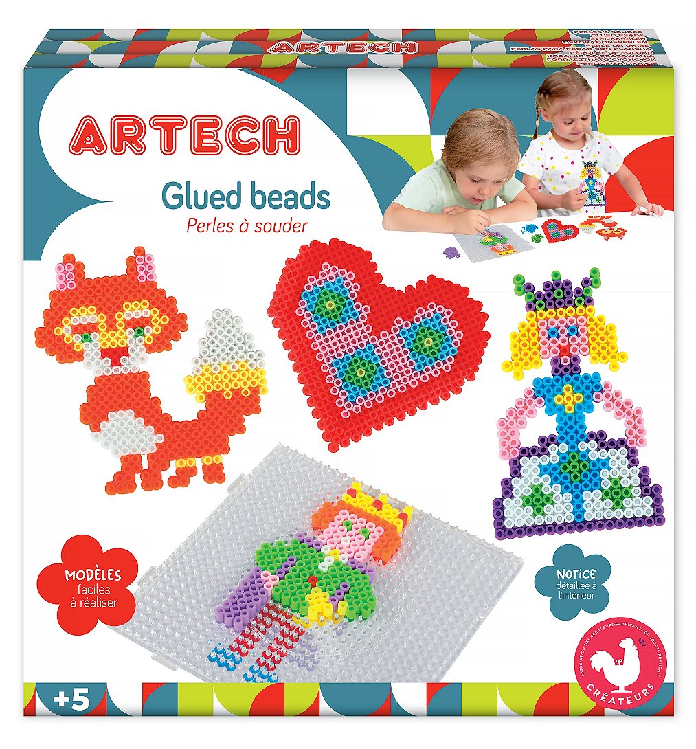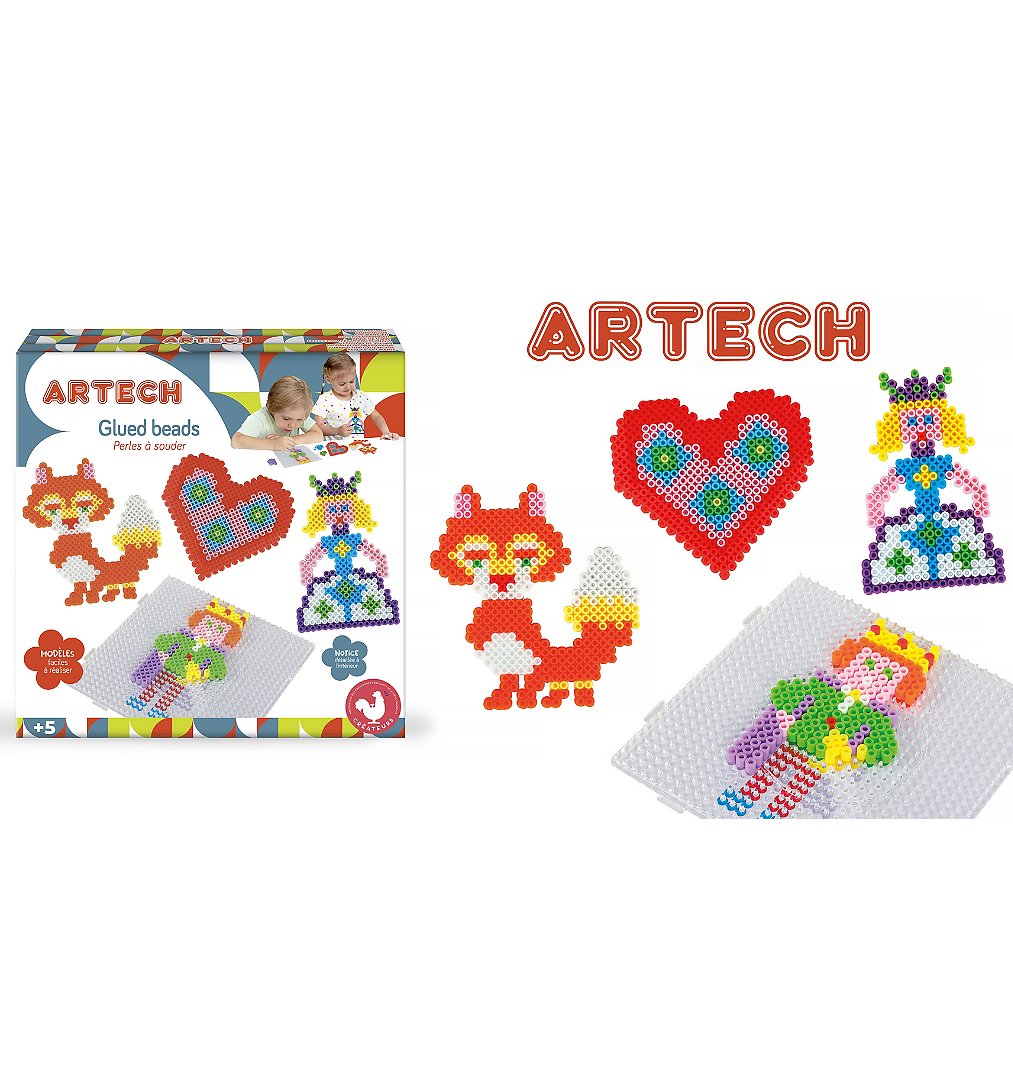 Coffret pour réaliser des motifs en perles (tableaux, dessins) à assembler au fer doux. Inclus différents modèles et de nombreuses perles de différentes couleurs.