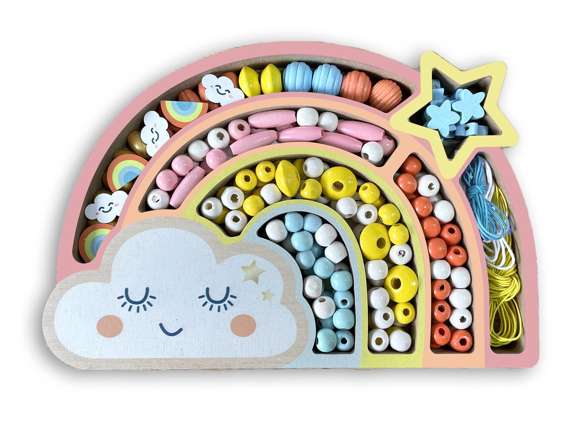 Un coffret original en forme d'arc en ciel contenant de jolies perles aux couleurs pastels pour créer de magnifiques bijoux : colliers, bracelets...Livré avec 3 mètres de fil, 180 perles, 1 sac de rangement dans un joli coffret qui sert aussi de plateau à bijoux.