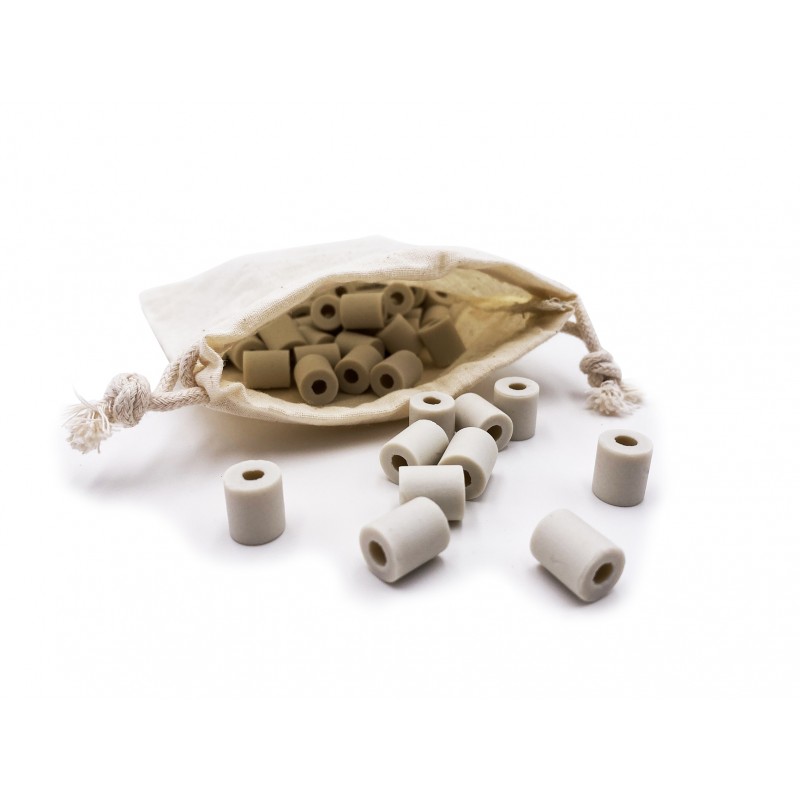 Le pouvoir des perles de céramique : La céramique, par le principe de résonance, revitalise et redynamise l’eau. Les perles en céramiques servent au traitement de l’eau : pour dynamiser l’eau du robinet et amoindrir nettement son mauvais goût, éviter le dépôt calcaire et favoriser la conservation des aliments. Leur forme leur permet un contact optimal avec l’eau grâce à une grande surface de contact en argile cuite (intérieur te extérieure des perles). Ce n’est pas un détartrant, mais neutralise le dépôt de calcaire. 50 perles de céramique lave-linge : veillez à ce que les perles restent bien enfermées dans la pochette en lin bio fourni avec. Laissez la pochette dans le tambour à chaque lavage. Le calcaire est l’un des plus grand ennemis de votre équipement électroménager. Les perles adoucissent l’eau et diminuent son PH.