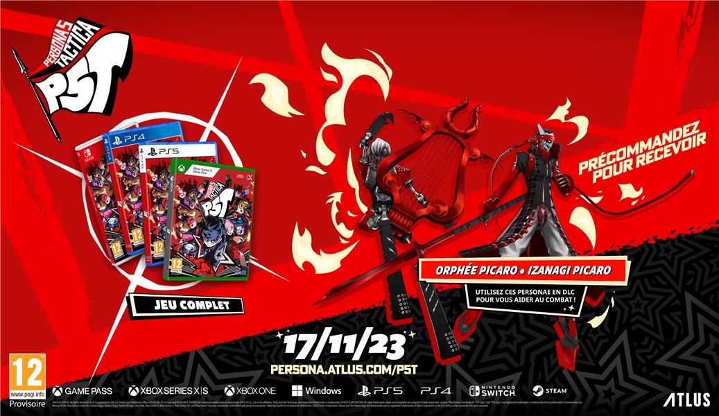 À la suite d'un incident étrange, les Voleurs fantômes errent dans un royaume étrange où les habitants subissent une oppression tyrannique. Encerclés par un groupe militaire appelé les Légionnaires, ils courent un grave danger jusqu'à ce qu'une mystérieuse révolutionnaire nommée Erina les sauve et leur propose une offre alléchante en échange de leur aide. Quelle vérité peut bien se cacher derrière Erina et le marché qu'elle propose aux Voleurs fantômes ? Persona 5 Tactica propose une toute nouvelle histoire, le retour de personnages appréciés des fans et de nouveaux alliés et ennemis. Rejoignez le groupe et prenez part à une révolution émotionnelle dans ce jeu palpitant mêlant aventure et combat. Caractéristiques : - UNE RÉVOLUTION ÉMOTIONNELLE : Prenez la tête d'une révolte populaire dans un tout nouveau scénario qui se déroule au coeur de l'univers emblématique de Persona.