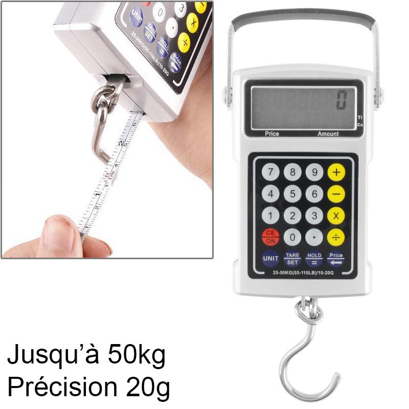 Cet appareil, aussi nommé un peson, peut peser des valises jusqu'à 50kg avec une précision à 20 g près ! Une très haute précision donc ! Il mesure aussi bien en kg, g, ca, t et lb. Le produit est même waterproof, vous pourrez donc l'utiliser dans toutes conditions, même pour peser de la glace ! Il dispose même d'une poignée pour un maniement plus facile.