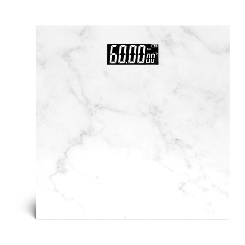 Pesée jusqu'à 180 kg, précision 50 g. Écran LCD. Plateau en verre et impression béton. Marche et arrêt automatique. Indicateur de batterie. 2 piles AAA incluse