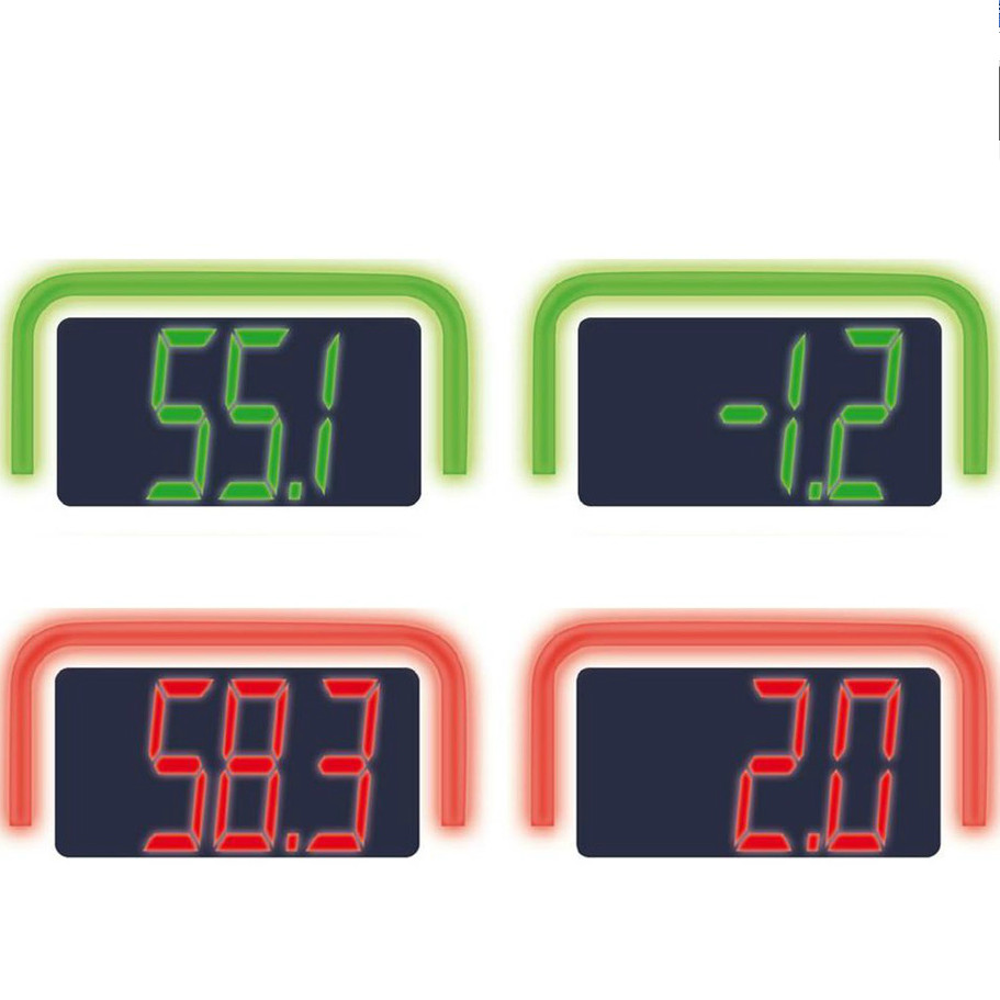 Ecran géant rétro-éclairé, 4 mémoires utilisateur, Affiche la variation de poids en couleur: rouge - vert - orange Pesée Electronique. Finition du plateau Verre & ABS Taille du plateau 32,50 X 32,50