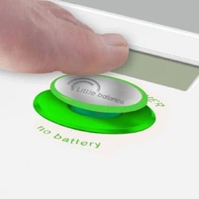 Le pèse-personne sans piles Green Power est libéré de toute contrainte : c'est l'utilisateur qui génère à chaque pesée l'énergie nécessaire par simple appui sur le bouton Magic-Start.