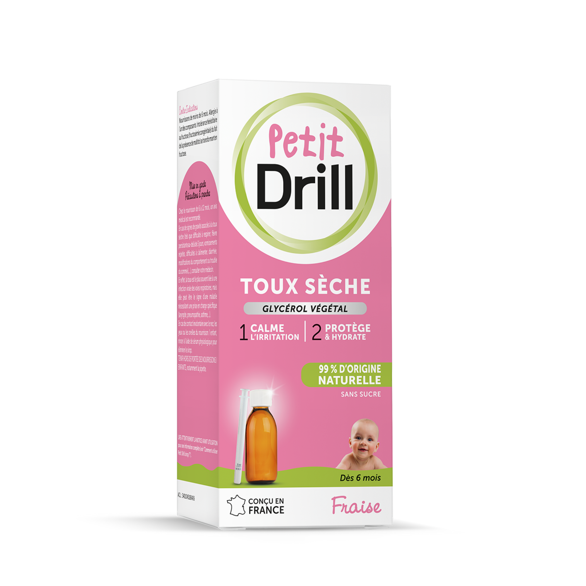 Petit Drill sirop est un dispositif médical qui soulage l’irritation associée à la toux sèche sans supprimer le réflexe de la toux. Ce sirop ne doit pas être utilisé avant 6 mois. Un avis médical est recommandé de 6 à 12 mois. Il peut être utilisé chez les enfants jusqu’à 6 ans. Formulé à base de glycérol végetal. Petit Drill possède une double-action : 1. Il calme localement l’irritation liée à la toux sèche et soulage les sensations douloureuses locales modérées. 2. Il hydrate et protège la gorge contre les agressions externes par la création d’un film protecteur. Sa formule à 99% d'origine naturelle est aromatisée à la fraise. Son utilisation est facilitée grâce à la pipette qui permet de délivrer la quantité nécessaire à l’enfant. Petit Drill sirop est également formulé sans sucre, sans colorant et sans paraben. Lire attentivement la notice avant utilisation. Demandez conseil à votre pharmacien. En cas de toux persistante s'aggravant. consultez un médecin. Fabricant : PIERRE FABRE MEDICAMENT DEVICES 29 avenue du Sidobre 81106 Castres Cedex France (sirop) ; ROVIPHARM, France (pipette). Ce dispositif médical est un produit de santé réglementé qui porte. au titre de cette réglementation. le marquage CE. Pipette graduée. Sans sucre. Sans paraben. Sans colorant. Fabriqué en France.