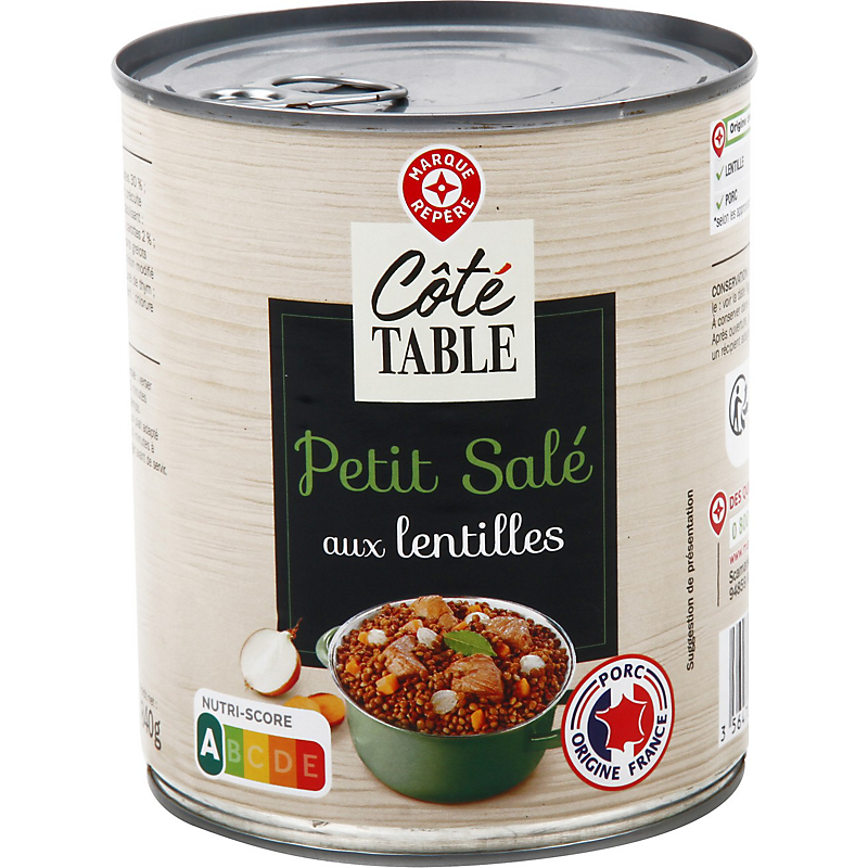 Ingrédients: Eau ; lentilles précuites 30 % ; viande de porc traitée en salaison et précuite 24 % (viande de porc ; eau ; sel ; stabilisant : E451 ; gélifiant : E407a) ; saindoux ; carottes 2 % ; double concentré de tomates ; oignons grelots 0,7 % ; oignons en poudre ; sel ; amidon modifié de maïs ; ail en poudre ; arôme naturel de thym ; arôme naturel de laurier ; affermissant : chlorure de calcium.