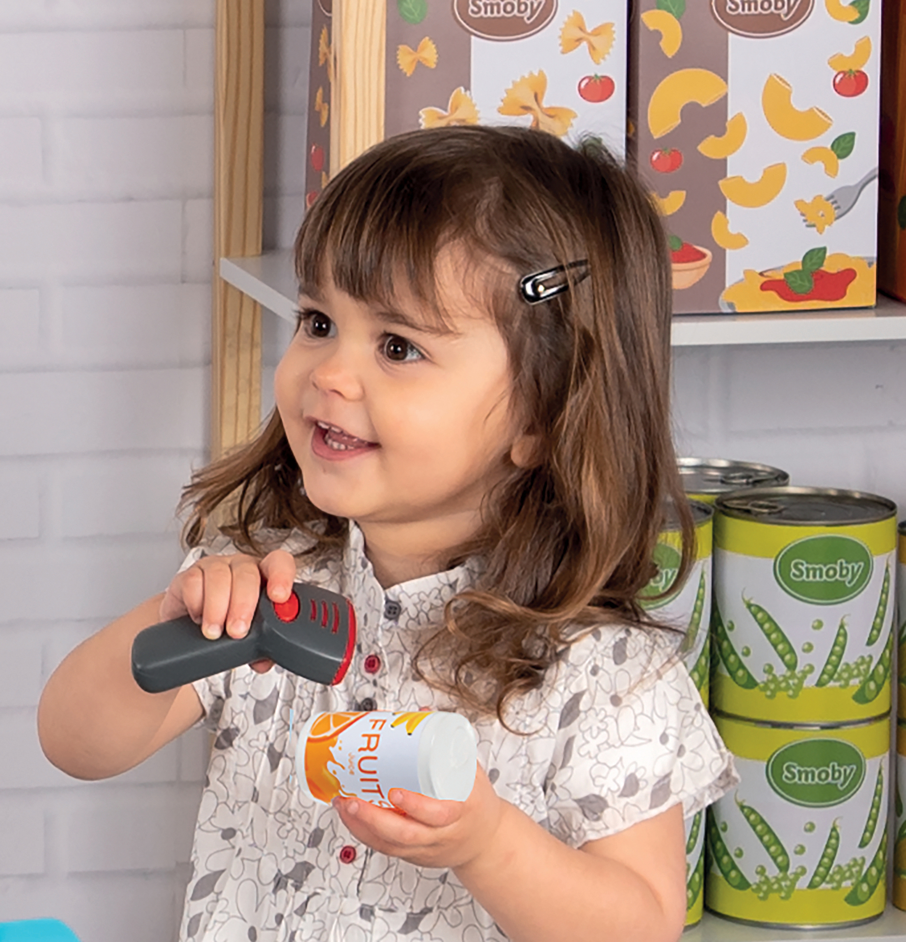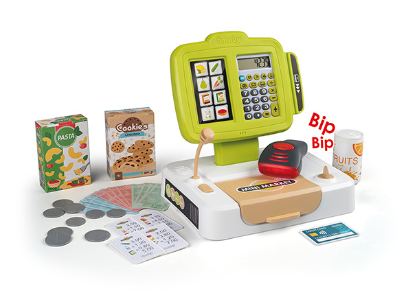 30 accessoires inclus : 1 lecteur de code-barres avec son et lumière, 1 cannette de jus de pomme, 2 boites factices (cookies/pâtes), 4 tickets de caisse, 12 billets, 9 pièces, et 1 carte bancaire.