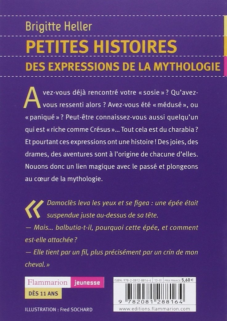 Petites histoires Des expressions de la mythologie Avez-vous déjà rencontré votre « sosie » ? Qu'avez-vous ressenti alors ? Avez-vous été « médusé », ou « paniqué » ? Peut-être connaissez-vous aussi quelqu'un qui est « riche comme Crésus »... Tout cela est du charabia ? Et pourtant ces expressions ont une histoire ! Des joies, des drames, des aventures sont à l'origine de chacune d'elles. Nouons donc un lien magique avec le passé et plongeons au coeur de la mythologie. « Damoclès leva les yeux et se figea : une épée était suspendue juste au-dessus de sa tête. - Mais... balbutia-t-il, pourquoi cette épée, et comment est-elle attachée ? - Elle tient par un fil, plus précisément par un crin de mon cheval. »