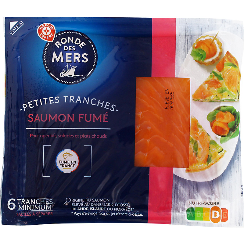 PETITES TRANCHES DE SAUMON ATLANTIQUE (SALMO SALAR) ÉLEVÉ AU DANEMARK, ÉCOSSE ( ROYAUME-UNI), IRLANDE, ISLANDE OU NORVÈGE*, FUMÉ - DÉCONGELÉES. *Pays d'élevage : voir sur la face avant de l'emballage. RONDE DES MERS