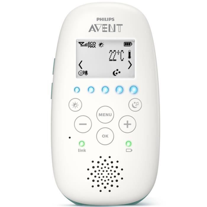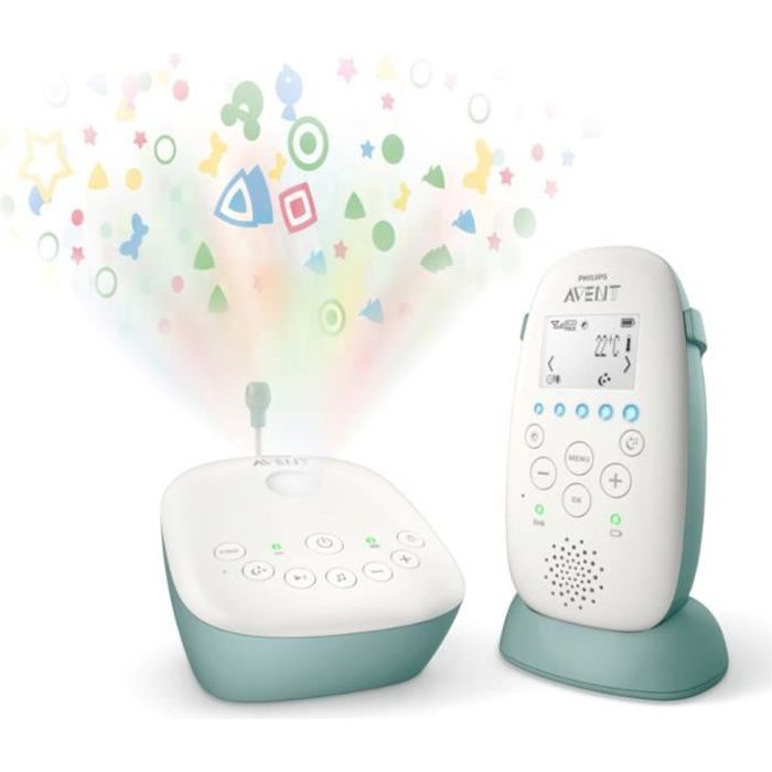 Projecteur d'étoile au plafond - Branchement MP3 - Écran LCD et base de charge sur l'unité parent - Capteur de température - Fonction "Page" et "répondre a bébé" - Jusqu'a 18h d'autonomie - Portée jusqu'a 330 m - Son limpide grâce a la technologie DECT - Mixte - Livré a l'unité
