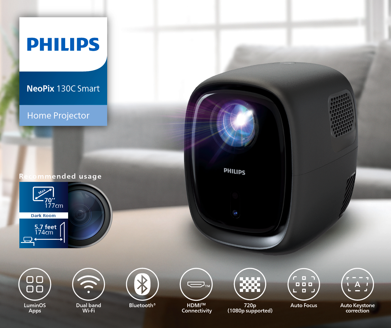 Philips NPX130C/INT. Technologie de projection: LED, Résolution native du projecteur: 720p (1280x720), Taille d'écran compatible: 0 - 1778 mm (0 - 70"). Type de source lumineuse: LED, Durée de vie de la source lumineuse: 30000 h. Mise au point: Auto. position de marché: Portable, Couleur du produit: Noir. Source d'alimentation: CC, Tension d'entrée AC: 100 - 240 V, Fréquence d'entrée AC: 50 - 60 Hz