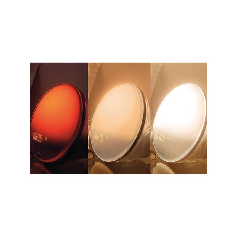 Eveil lumière - Réveillez-vous naturellement avec une simulation colorée de lever du soleil (augmentation progressive pendant 30 minutes) - La couleur de l'aube passe d'un rouge délicat à un orange chaleureux, puis à un jaune éclatant - 20 réglages de luminosité, à choisir selon vos préférences - Choix entre 7 sons naturels différents pour votre réveil - Radio FM pour vous réveiller au son de votre émission préférée - Touchez simplement le dessus de l'appareil pour activer le mode Répétition - Lumière douce pour vous guider dans le noir - Atténuation progressive de l'éclairage et du son pour faciliter le sommeil - Affichage à luminosité variable automatique : La luminosité de l'afficheur s'ajuste automatiquement en fonction de la luminosité de la chambre - Sans UV - Intensité lumineuse 300 Lux - Coloris blanc.