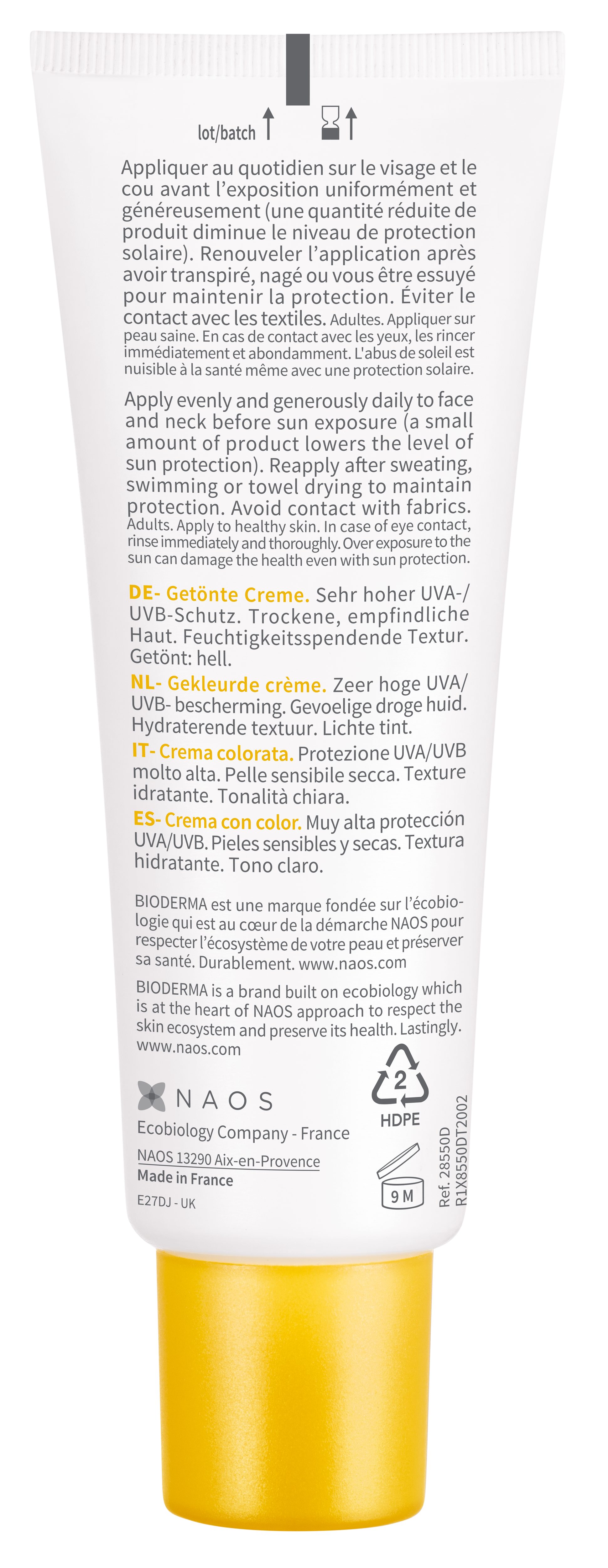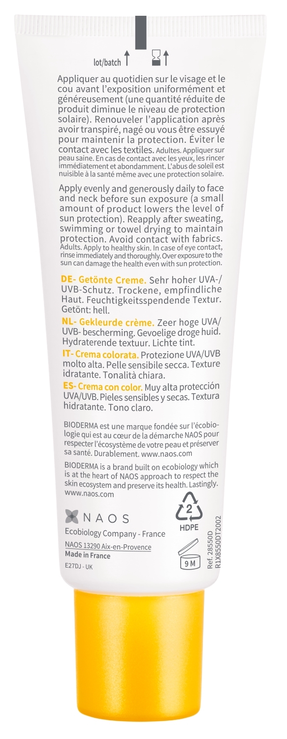 "Peaux sensibles sèches. Exposition solaire intense. Propriétés : texture confortable et hydratante. Formule teintée adaptée aux peaux claires. Teint hâlé et unifié. Sans effet gras au cours de la journée. Fini sec. Excellente base de maquillage. Très bonne tolérance cutanée et oculaire dans les conditions normales d’utilisation. Testé sous contrôle dermatologique et ophtalmologique. Photostable.