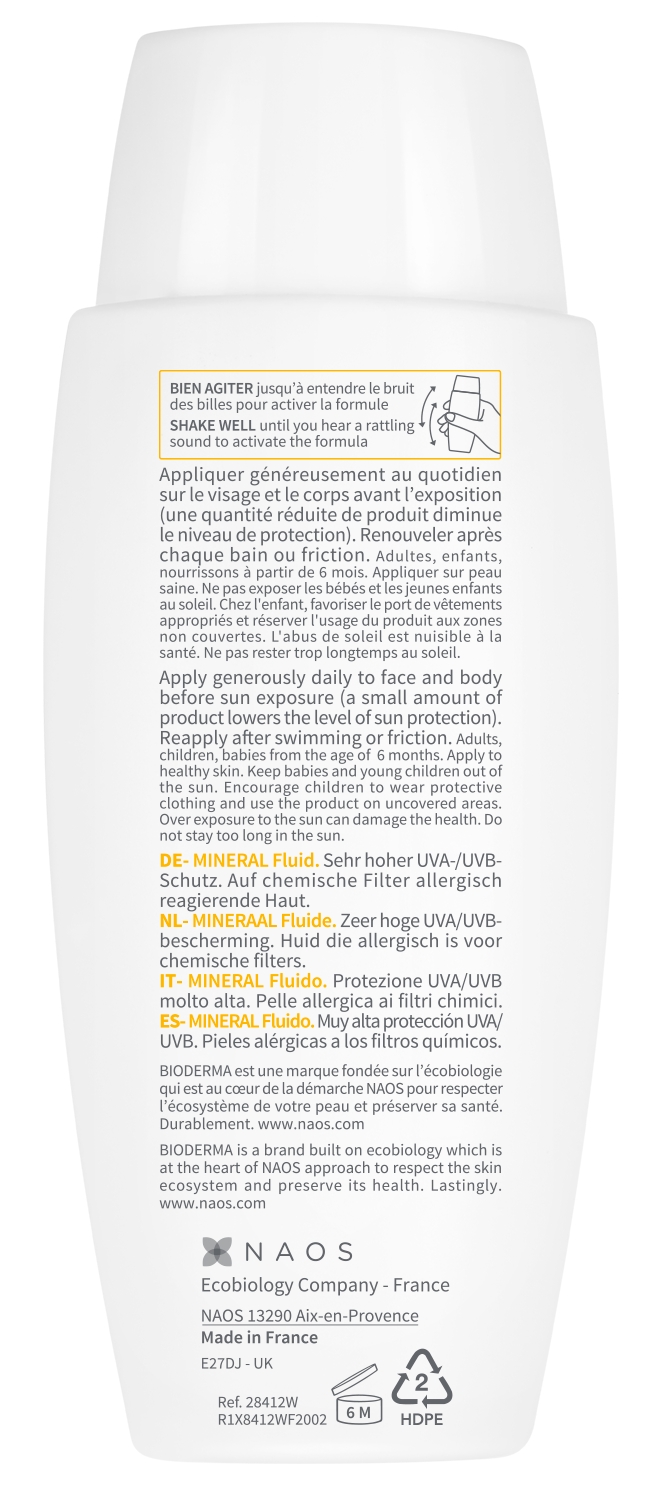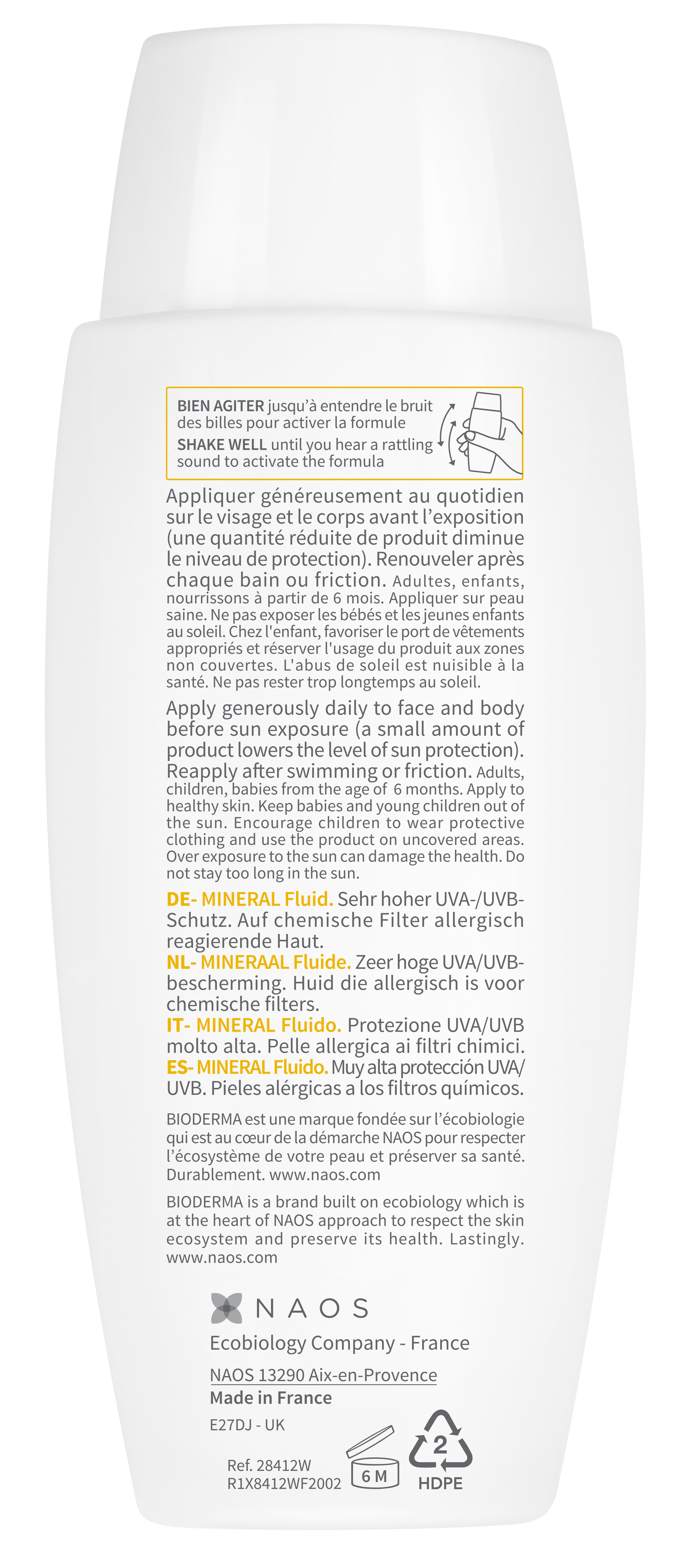 Peaux allergiques aux filtres chimiques et au parfum. Peaux intolérantes à tous types d’ensoleillement. Adultes, enfants, nourrissons à partir de 6 mois. Filtres 100% minéraux. Très haute protection UVA/UVB. Texture fluide ultra-légère. Pénètre rapidement et laisse la peau confortable. La CELLULAR PROTECTION protège les cellules du stress oxydatif grâce à la vitamine E antioxydante. Non desséchant. Très bonne tolérance cutanée et oculaire dans les conditions normales d’utilisation. Testé sous contrôle dermatologique, pédiatrique et ophtalmologique. Non comédogène. Photostable.