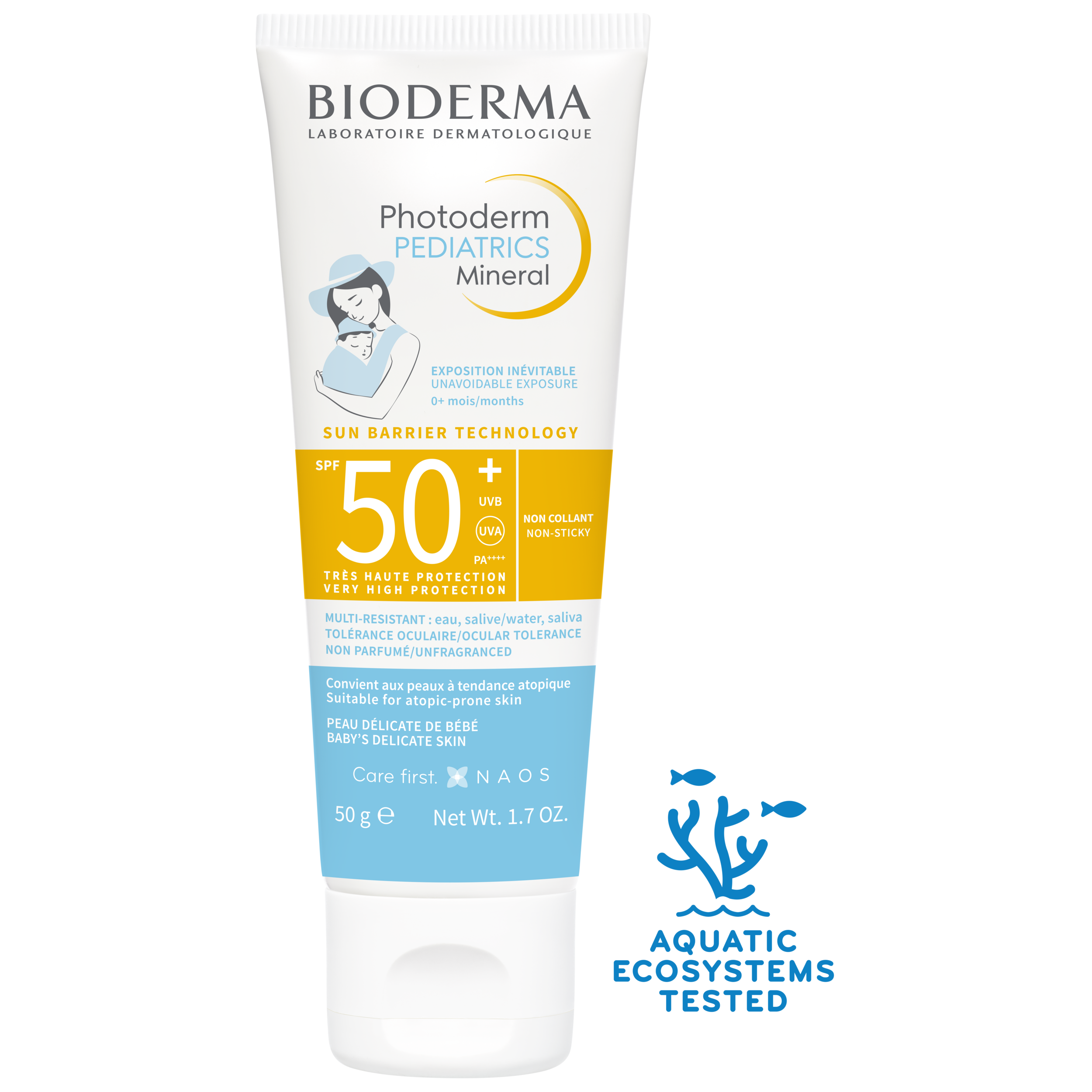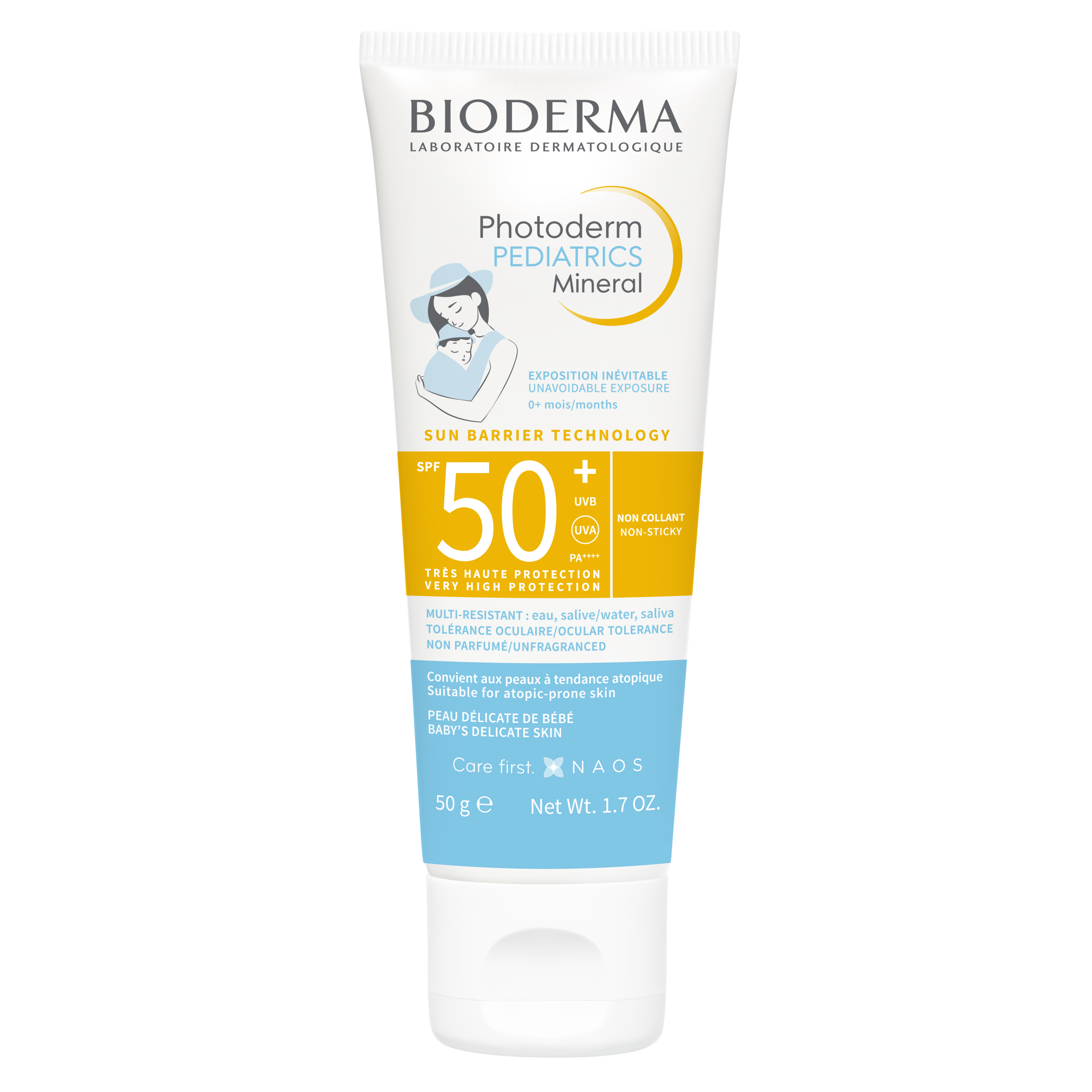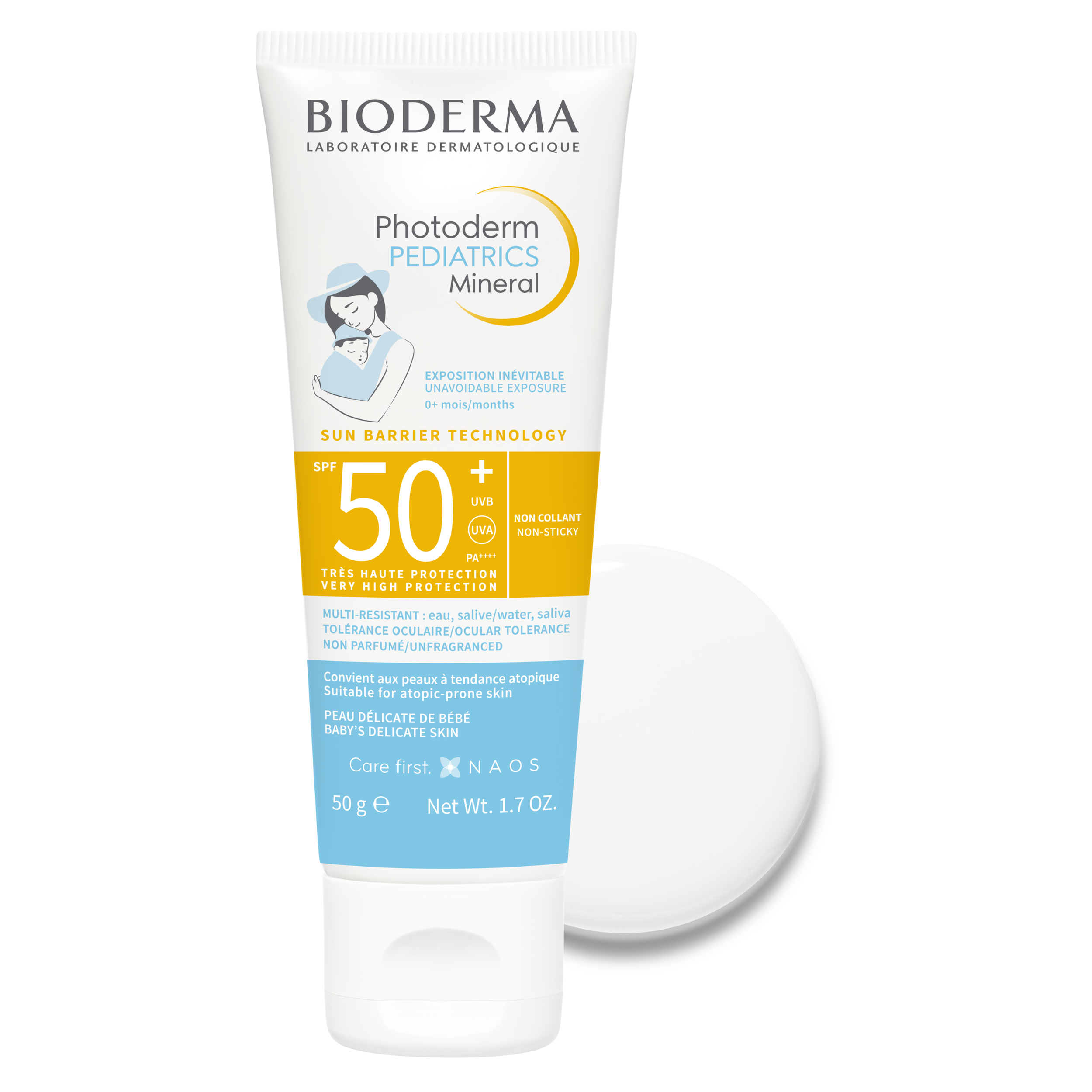 SPF50+ UVA 23. Très haute protection 100% minérale large spectre : UVB, UVA courts et longs. Exposition inévitable des zones non couvertes des bébés de 0 à 36 mois. texture légère et fondante. Laisse la peau de bébé douce et confortable. Application facile, absorption rapide. Non-collant et non-gras. Très bonne tolérance cutanée et oculaire dans les conditions normales d’utilisation. Testé sous contrôle pédiatrique, dermatologique et ophtalmologique. Photostable.