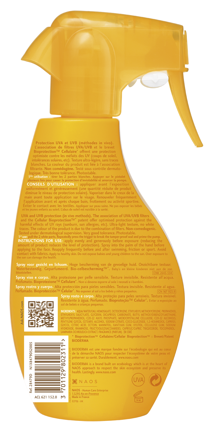 Notre spray solaire SPF30 parfumé est idéal pour lutter efficacement contre les rayons UVA et UVB. Pour faire rimer plaisir avec sécurité, cette protection solaire parfumée apporte à votre peau une douce odeur estivale. Elle préserve notamment la jeunesse de la peau grâce au complexe breveté Bioprotection Cellulaire. Ce dernier permet à l'épiderme de mieux se défendre face aux agressions du soleil. Ce spray protection solaire visage et corps pénètre rapidement et ne laisse pas de film gras. Pour un soin complet de votre peau exposée, appliquez chaque soir le lait après-soleil Photoderm. Votre peau sera réhydratée et votre bronzage prolongé. Ce produit est formulé et fabriqué en France.
