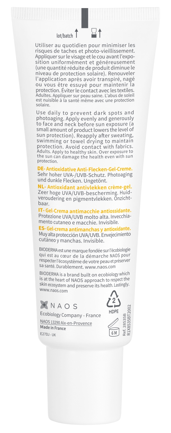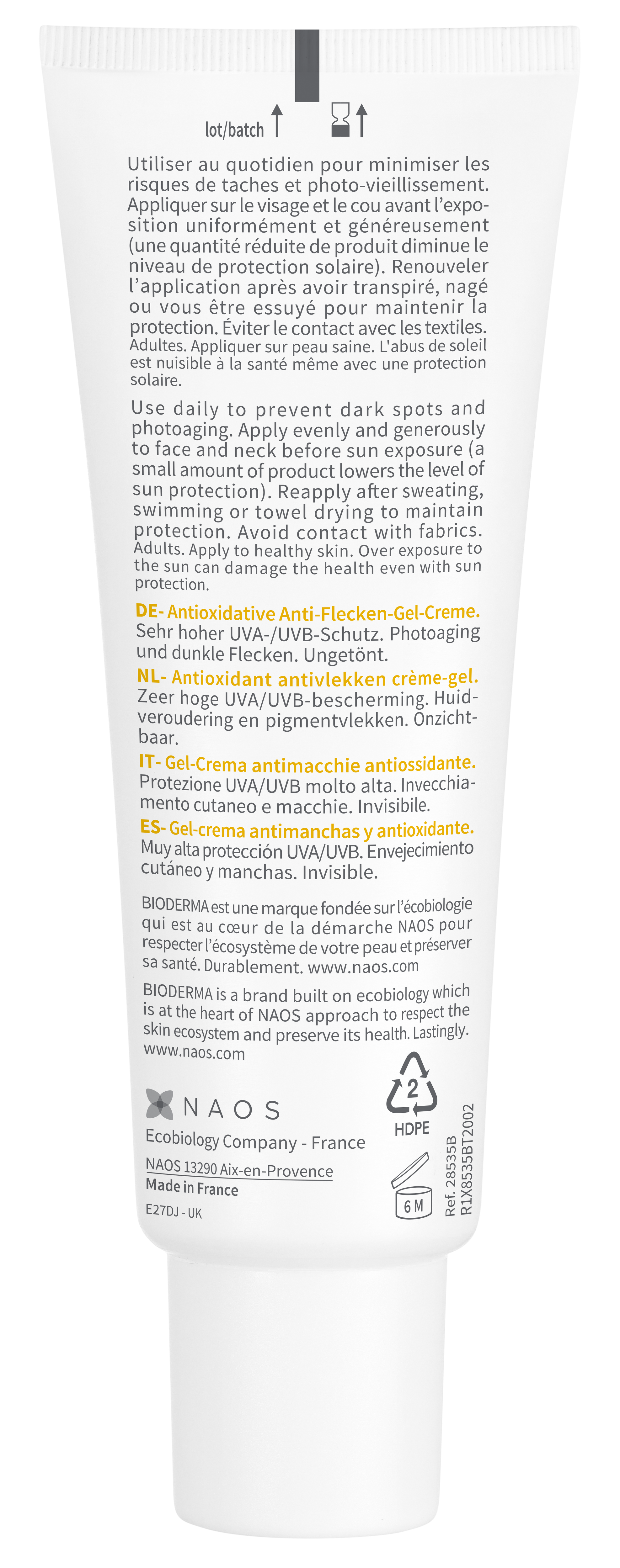 Texture gel-crème hydratante. Prévient et corrige les signes visibles du photo-vieillissement dès 28 jours. Estompe les taches, lisse les ridules et régénère la peau. La vitamine E et la vitamine C* hautement stable offrent une protection antioxydante complémentaire contre le spectre solaire total et la pollution, et aident à prévenir l’apparition de nouvelles taches. La vitamine C* et la Centella asiatica stimulent la synthèse de collagène. Excellente base de maquillage. Très bonne tolérance cutanée et oculaire dans les conditions normales d’utilisation. Testé sous contrôle dermatologique et ophtalmologique. Non comédogène. Photostable.