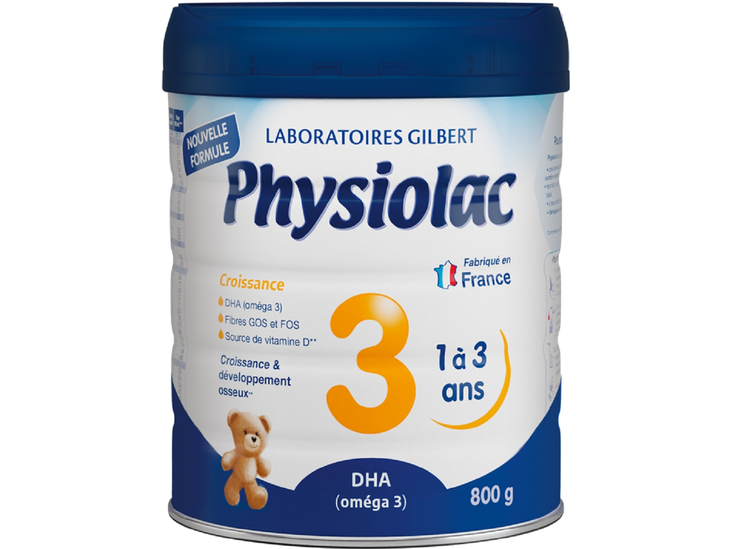 Physiolac 3 contient notamment : - du DHA* (oméga 3), - des fibres GOS et FOS, - du bisglycinate de fer assimilable, - de la vitamine D nécessaire au maintien d’une bonne croissance et d’un bon développement osseux. *Conformément à la réglementation.