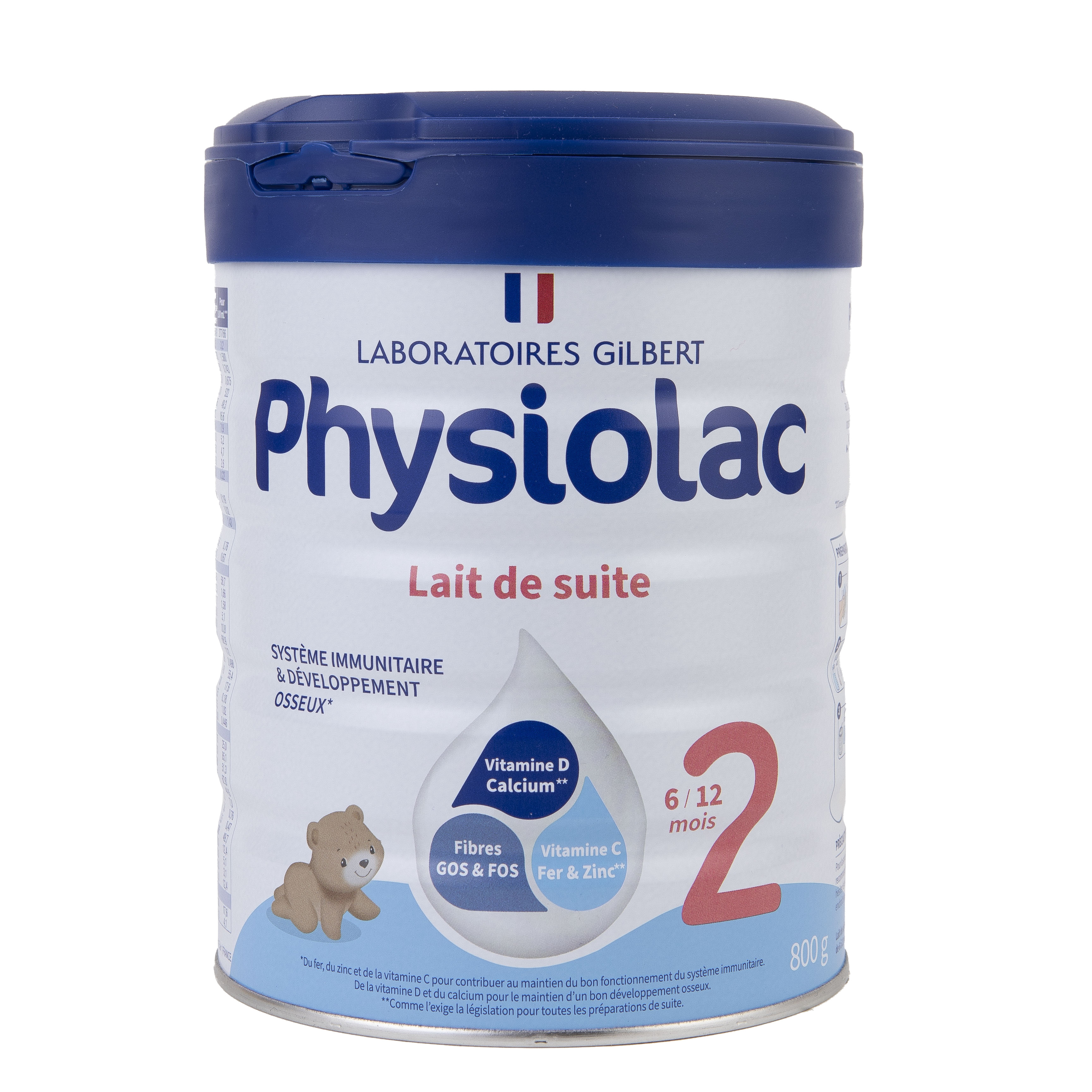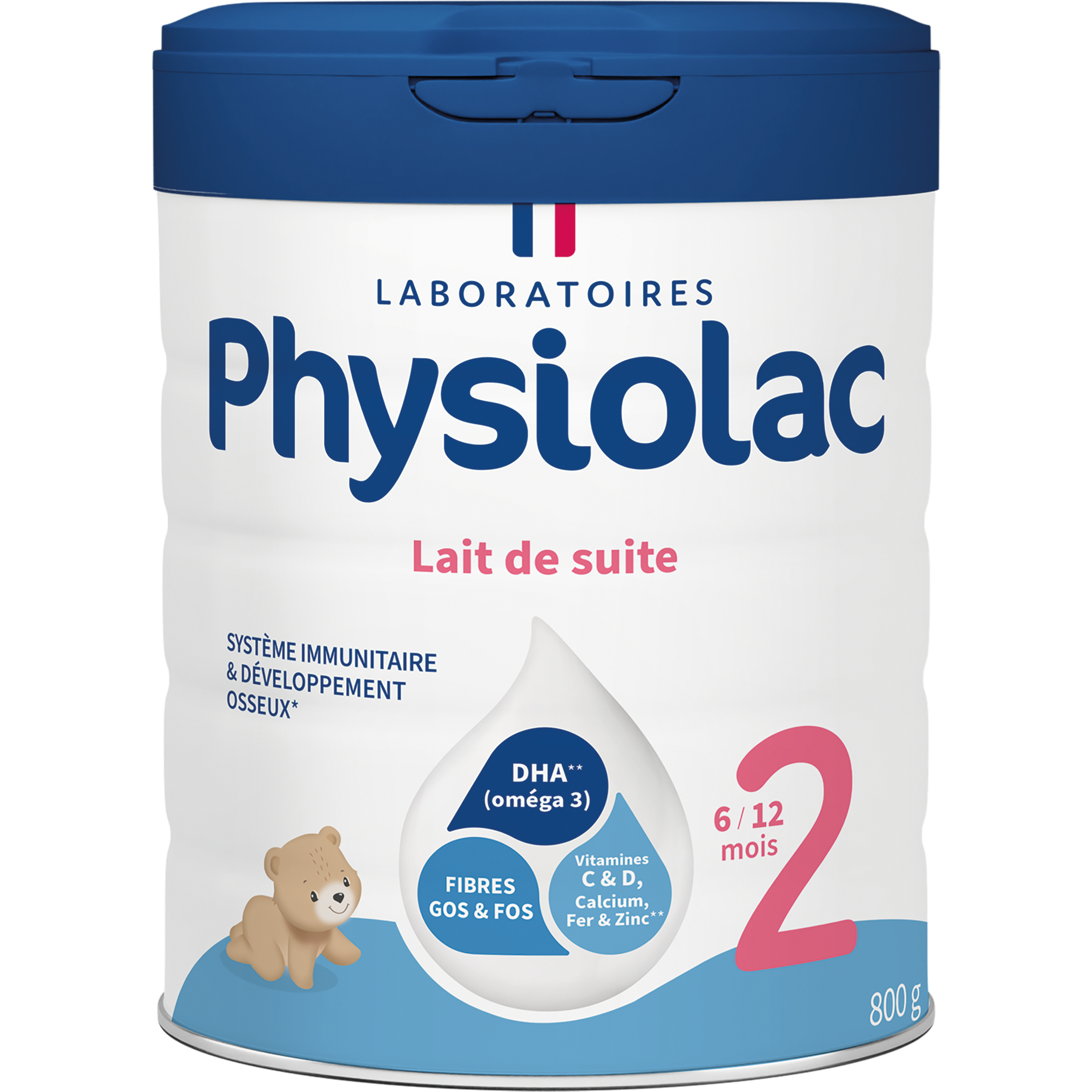 Lait de suite en poudre pour nourrissons de 6 à 12 mois. Les Laboratoires Physiolac proposent des laits : • spécialement développés et validés par des experts en nutrition infantile, • répondant aux besoins nutritionnels spécifiques des bébés*, • à base de lait écrémé 100% français, • fabriqués en France. Physiolac 2 contient notamment : • du DHA* (oméga 3), • des fibres GOS et FOS, • du bisglycinate de fer assimilable, • du fer, du zinc et de la vitamine C pour contribuer au maintien du bon fonctionnement du système immunitaire, • de la vitamine D et du calcium pour le maintien d'un bon développement osseux. *Comme l'exige la législation pour toutes les préparations de suite.
