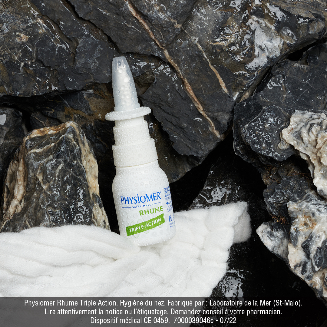 - Indiqué pour le nez bouché en cas de Rhume pour les adultes et les enfants à partir de 6 ans. - Dégage le nez bouché en 3 minutes . - Dégage le nez par action osmotique naturelle. Favorise l'évacuation des virus et bactéries par effet mécanique de drainage. Aide à réduire le risque de complication du rhume. - Embout Nasal spécifiquement adapté, sans gaz propulseur et stérile. - EFFICACITÉ CLINIQUEMENT PROUVÉE chez l’adulte et chez l’enfant à partir de 6 ans, 100 % eau de mer naturelle et au parfum d'huiles essentielles, désodée et non diluée. Solution hypertonique, plus salée que les solutions isotoniques, qui crée une décongestion mécanique par appel d’eau. pH optimal pour la muqueuse nasale. Sans conservateur. - Ce dispositif médical est un produit de santé qui porte au titre de cette réglementation le marquage CE. Lire attentivement la notice ou l’étiquetage. Demandez conseil à votre pharmacien. Fabriqué par : Laboratoire de la Mer (St-Malo). Physiomer® Rhume Triple Action possède une formule spécifique alliant une eau de mer 100% non diluée, des huiles essentielles de sapin baumier et citron certifiées Bio ainsi qu’un extrait naturel de menthol. Il garantit une triple action efficace sur le nez. En cas de nez bouché, Physiomer® Rhume Triple Action permet de : - Dégager le nez en moins de 3 minutes - Éliminer les virus et les bactéries des fosses nasales - Participer à la protection contre les infections. EFFICACITE CLINIQUEMENT PROUVEE chez l’adulte et chez l’enfant à partir de 6 ans. COMPOSITION: 100% eau de mer naturelle, désodée, non diluée et hypertonique (concentration équivalente à 22 g/L en sels minéraux totaux) , Huiles essentielles de sapin baumier et citron certifiées Bio, extrait naturel de menthol, Sans conservateur, Stérile CONSEIL D'UTILISATION: Nez bouché en cas de rhume : - Adulte : 1 pulvérisation dans chaque narine jusqu’à 6 fois par jour - Enfant 6 à 15 ans : 1 pulvérisation dans chaque narine jusqu’à 4 fois par jour Ne pas utiliser durant la grossesse et l’allaitement, ou en cas d’allergie à l’un des ingrédients. Si les symptômes persistent au-delà de 7 jours, consultez votre médecin. Utiliser sous 6 mois après le premier usage. PRECAUTIONS D'EMPLOI: TENIR HORS DE LA PORTÉE ET DE LA VUE DES ENFANTS. Réservé aux enfants de plus de 6 ans et aux adultes. Ne pas utiliser durant la grossesse et l’allaitement, ou en cas d’allergie à l’un des ingrédients. Si les symptômes persistent au-delà de 7 jours, consultez votre médecin. Utiliser sous 6 mois après le premier usage. PHYSIOMER Rhume Triple Action– Ce dispositif médical est un produit de santé qui porte au titre de la réglementation le marquage CE. Lire attentivement la notice avant utilisation. Demandez conseil à votre pharmacien. Fabricant: Laboratoire de la Mer – Juillet 2020. Dispositif médical CE. CONTENANCE: 20 ml 7000029584 – 07/20