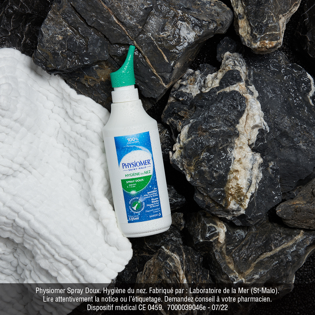 Physiomer® Spray lave, hydrate et désencombre les fosses nasales. Son jet en spray permet une utilisation au quotidien et évacue les sécrétions en excès tout en douceur. Physiomer® Spray permet de: En hygiène quotidienne : - Diminuer la viscosité du mucus, faciliter son élimination - Nettoyer les fosses nasales et évacuer les agents infectieux et allergènes - Participer à la protection contre les infections. - Le jet en spray est particulièrement adapté pour une utilisation quotidienne tout en douceur et ce dès l’âge de 2 ans. En cas de rhume : - Dégager le nez encombré - Eliminer l’excès de mucus Physiomer Spray Doux – Ce dispositif médical est un produit de santé qui porte au titre de la réglementation le marquage CE.