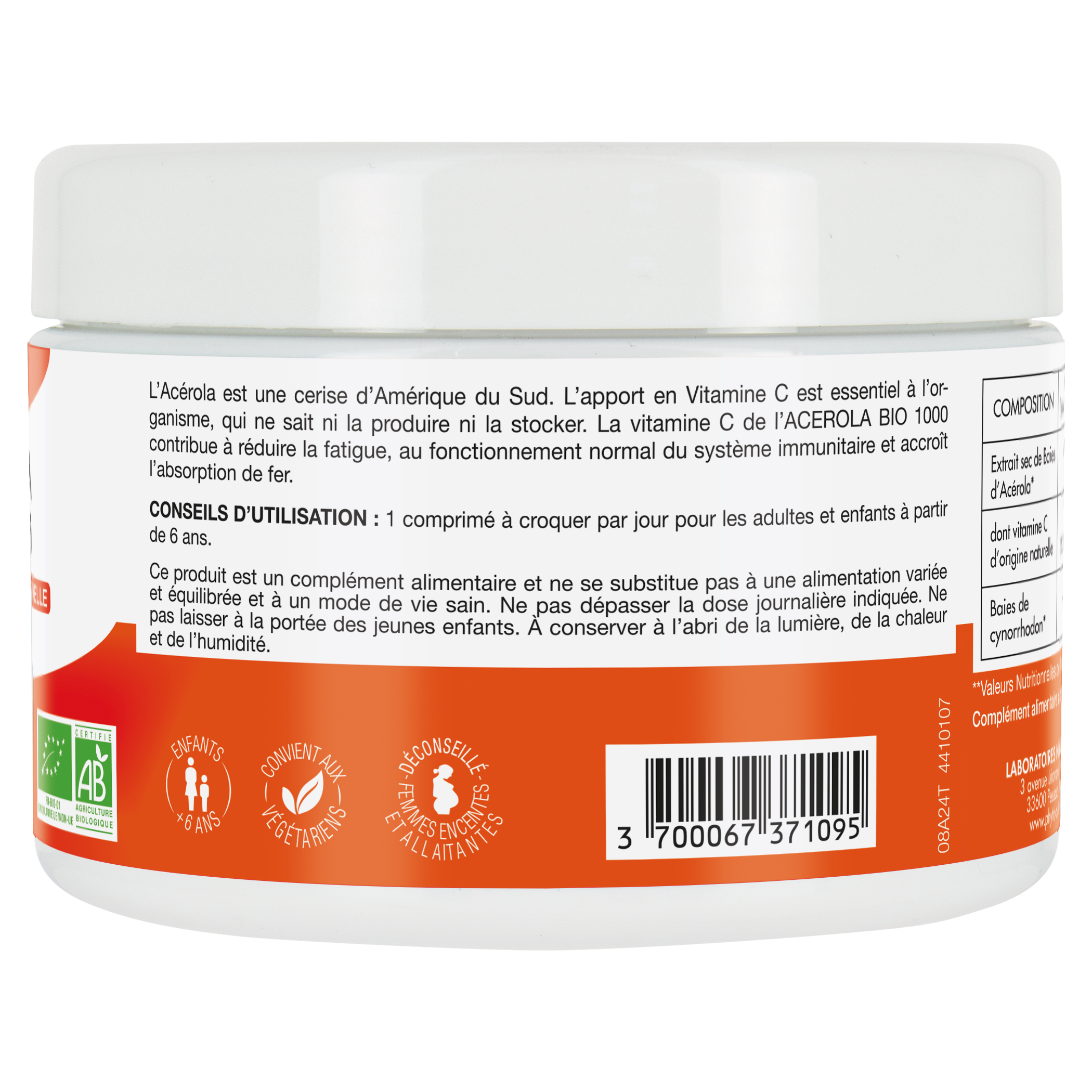 Acerola Bio 1000, votre solution naturelle anti-fatigue. L'acérola est une cerise issue de l'agriculture biologique d'Amérique du Sud dont la teneur en vitamine C est jusqu'à 80 fois supérieure à celle de l'orange. L'ACEROLA BIO 1000 est dosée à 1000 mg d'acérola bio soit 170 mg de vitamine C naturelle par comprimé. Essentielle, la vitamine C contribue à réduire la fatigue, aide au fonctionnement normal du système immunitaire pour aider à rendre votre organisme plus résistant aux attaques extérieures. L'organisme ne sachant ni la produire ni la stocker, il est indispensable d'en apporter quotidiennement grâce aux compléments alimentaires, pour maintenir vitalité et énergie. Elle augmente l'absorption de fer et contribue à la formation normale du collagène pour assurer la fonction normale de la peau. 100 % des ingrédients agricoles sont issus de l'Agriculture Biologique 100 % Origine Naturelle Fabriqué en France 0% Vitamine de synthèse 0% Conservateur 0% Arômes artificiels 0% Colorant