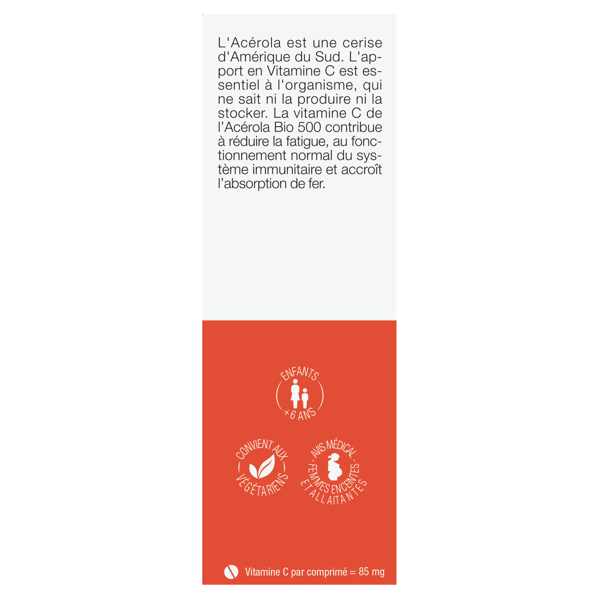 Vitamine C d'origine naturelle issue de l'Acérola Bio L'Acérola est une cerise d'Amérique du Sud. L'apport en Vitamine C est essentiel à l'organisme, qui ne sait ni la produire ni la stocker. Acérola Bio 500 et sa richesse en vitamine C d'origine naturelle contribue à réduire la fatigue, au fonctionnement normal du système immunitaire et accroît l'absorption de fer. Sans colorant, sans agent conservateur sans arômes artificiels sans vitamine C de synthèse 85mg de vitamine C par comprimé ( 100% des VNR) Enrichie en baies de cynorrhodon Format à croquer, Arôme Fruits rouges