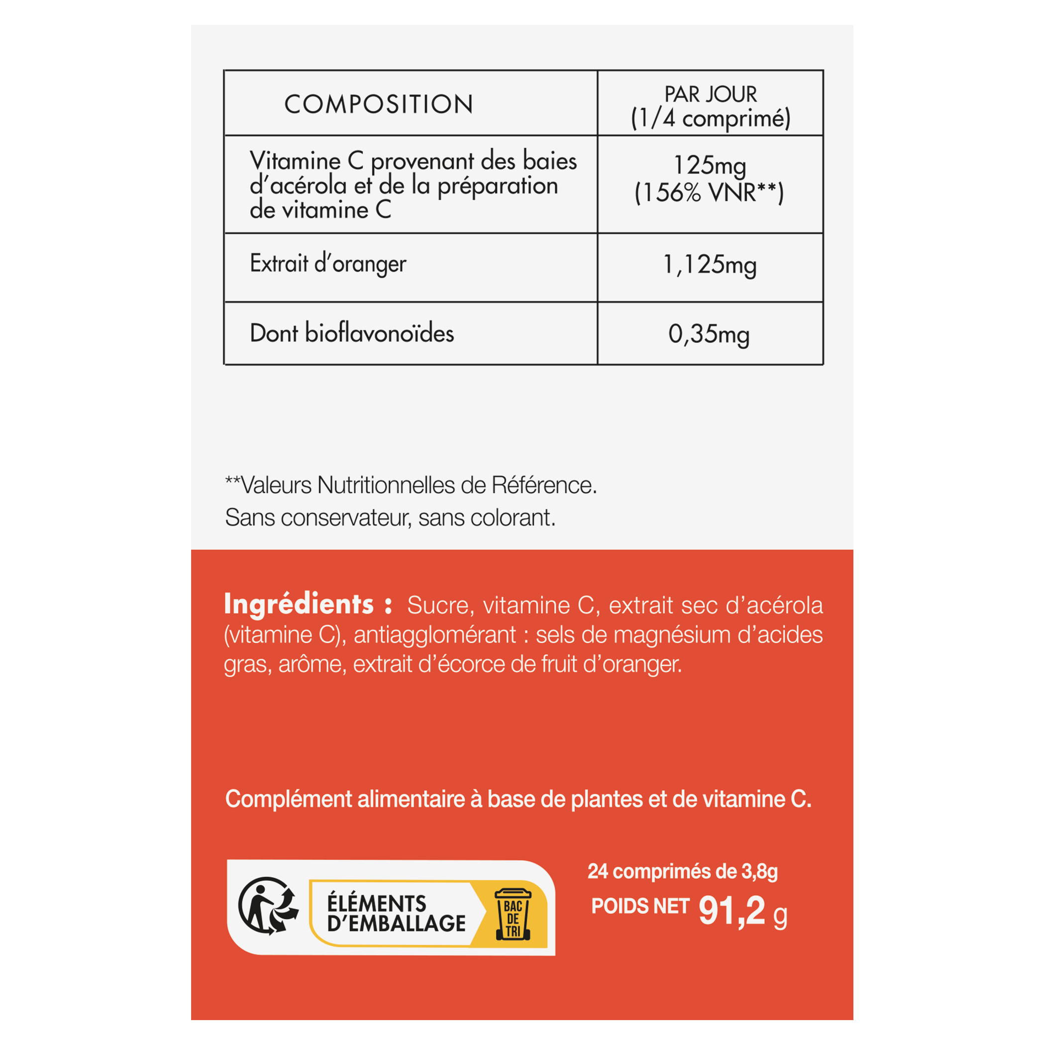 Ingrédients : Sucre, Vitamine C, Extrait Sec D'Acérola (Vitamine C), Antiagglomérant : Sels De Magnésium D'Acides Gras, Arôme, Extrait D'Écorce De Fruit D'Oranger.