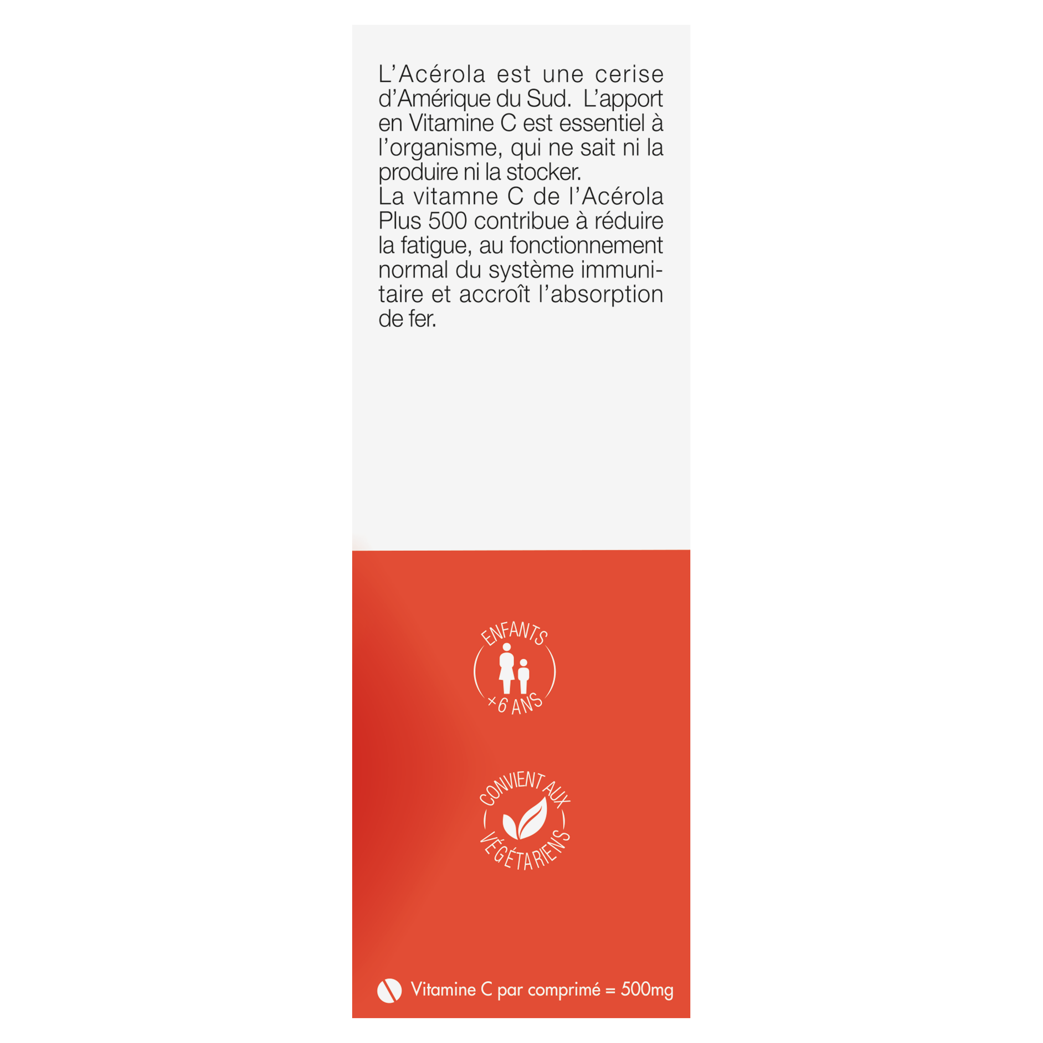 Acerola Plus 500, la solution anti-fatigue fruit de la rencontre Vitamine C naturelle et synthètique. L'acérola est une cerise issue de l'agriculture biologique d'Amérique du Sud dont la teneur en vitamine C est jusqu'à 80 fois supérieure à celle de l'orange. L'ACEROLA Plus 500 est le mix parfait entre vitamine C naturelle et synthétique pour un apport de 500 mg de vitamine C par comprimé. Essentielle, la vitamine C contribue à réduire la fatigue, aide au fonctionnement normal du système immunitaire pour aider à rendre votre organisme plus résistant aux attaques extérieures. L'organisme ne sachant ni la produire ni la stocker, il est indispensable d'en apporter quotidiennement grâce aux compléments alimentaires, pour maintenir vitalité et énergie. Elle augmente l'absorption de fer et contribue à la formation normale du collagène pour assurer la fonction normale de la peau. Fabriqué en France Arôme naturel Orange Enrichi en Baie de cynorrhodon 0% Conservateur 0% Colorant Synergie vitamine C naturelle issue de l'acerola et de synthèse