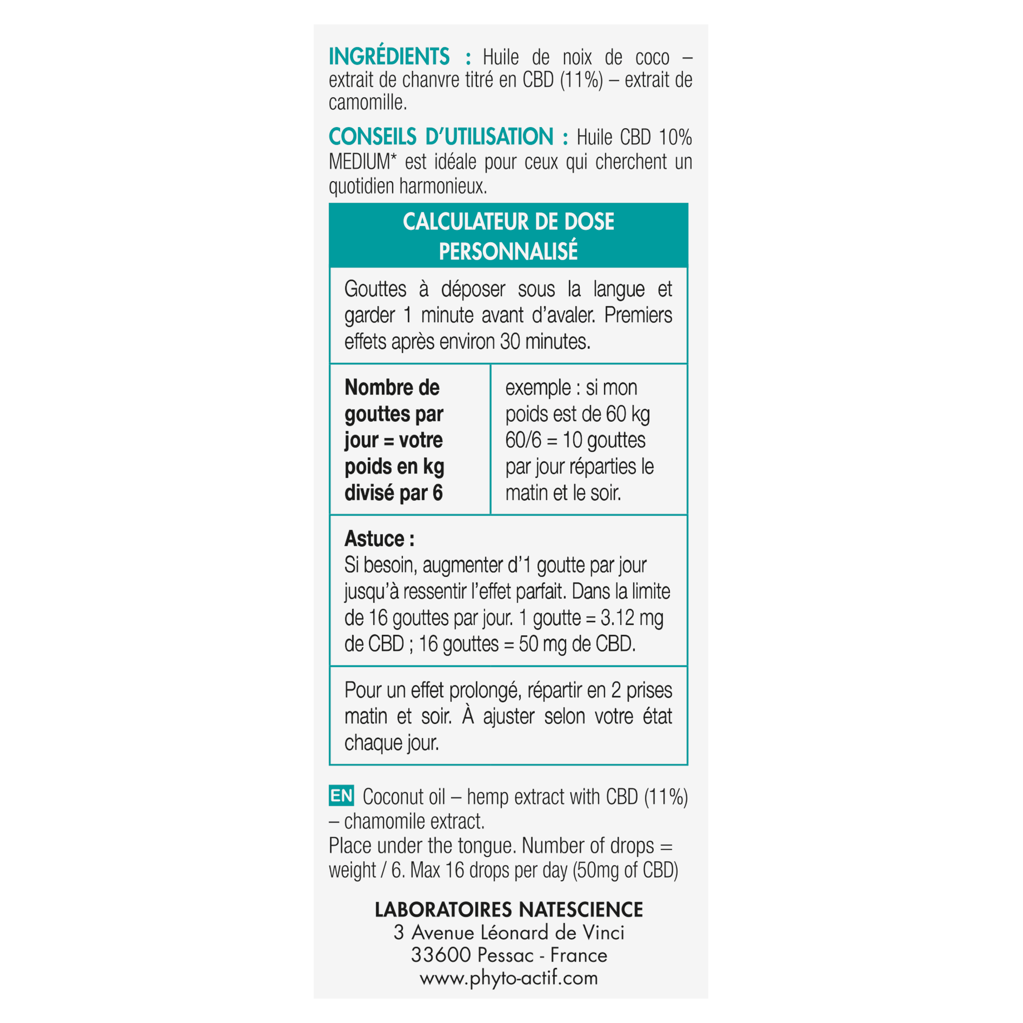 | Libellé | Phyto Actif Huile 10% CBD 10ml Flacon |