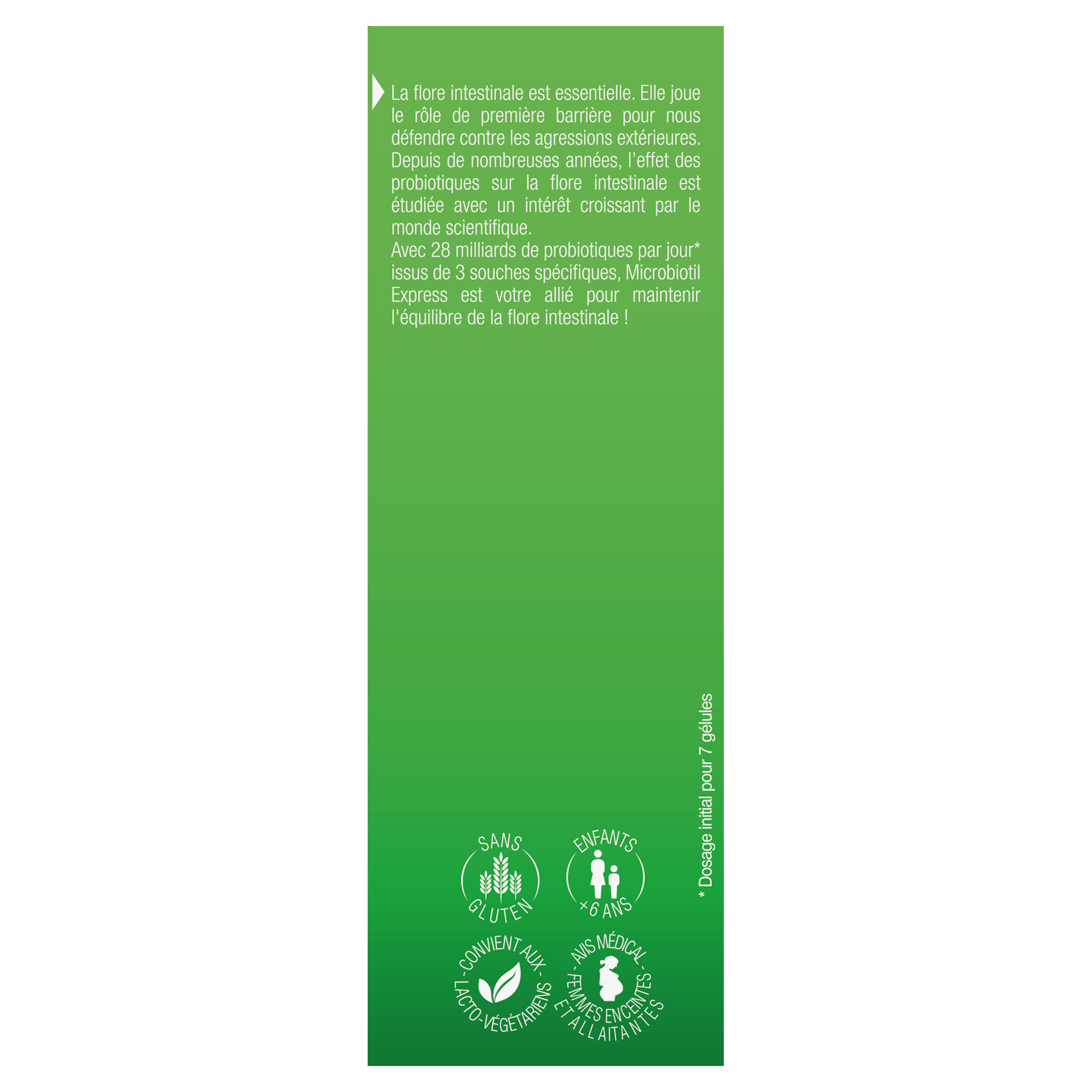 La flore intestinale est essentielle. Elle joue le rôle de première barrière pour nous défendre contre les agressions extérieures. Depuis de nombreuses années, l'effet des probiotiques sur la flore intestinale est étudiée avec un intérêt croissant par le monde scientifique. Avec 28 milliards de ferments lactiques par jour* issus de 3 souches spécifiques et associés à des fibres naturelles prébiotiques issues de la gomme d'acacia, Microbiotil Express est votre allié pour un rééquilibrage du transit ! ACTIFS 100% origine naturelle SANS additif chimique SANS édulcorant Fabriqué en France Sans colorant, sans agent conservateur, sans arômes artificiels, sans sucres ajoutés(²). (²) Contient des sucres naturellement présents. 28 Milliards de ferments lactiques 3 souches spécifiquement sélectionnées Association de probiotiques & prébiotiques Pour le rééquilibrage du Transit
