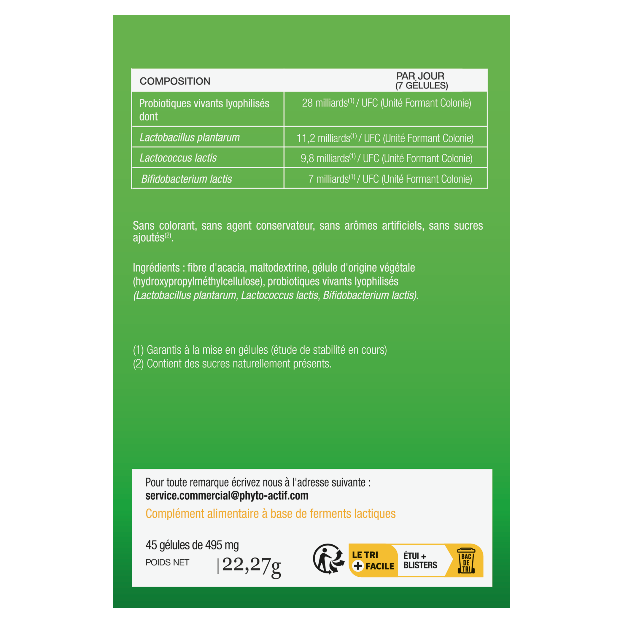 Ingrédients : fibre d'acacia, maltodextrine, gélule d'origine végétale (hydroxypropylméthylcellulose), probiotiques vivants lyophilisés (lactobacillus plantarum, lactococcus lactis, bifidobacterium lactis). ce produit peut contenir des traces de sulfites, de lait, de soja. sans colorant, sans agent conservateur, sans arômes artificiels, sans sucres ajoutés(²). (²) contient des sucres naturellement présents.
