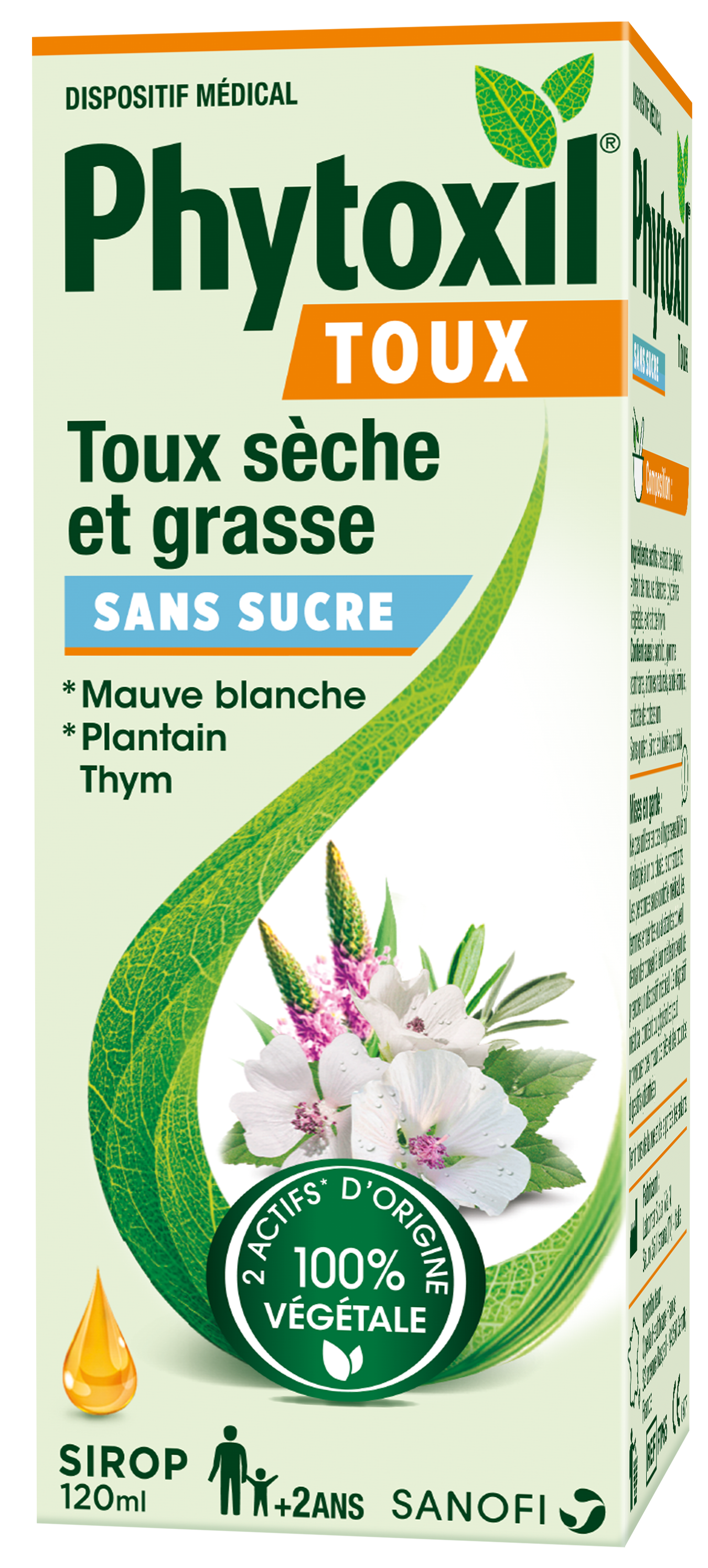 Sanofi Phytoxil Sirop sans Sucre 120 ml est un sirop qui permet de soulager la toux (toux sèche et toux grasse) à base de Thym, Plantain et de Mauve blanche. Ce sirop pour la toux est un dispositif médical qui est indiqué pour soulager la toux sèche ou la toux grasse et lorsque celle-ci est associée à une infection des voies respiratoires supérieures. Ce sirop agit sur : - la toux grasse grâce à l'action combinée du plantain, du thym, qui fluidifient le mucus en l'hydratant pour favoriser l'expectoration physiologique. - la toux sèche grâce à l'action muco-adhésive de la mauve blanche et du glycérol qui forment un film protégeant la muqueuse des agents extérieurs irritants. - l'irritation de la gorge grâce à l'action tapissante de la mauve blanche, du plantain et du thym.